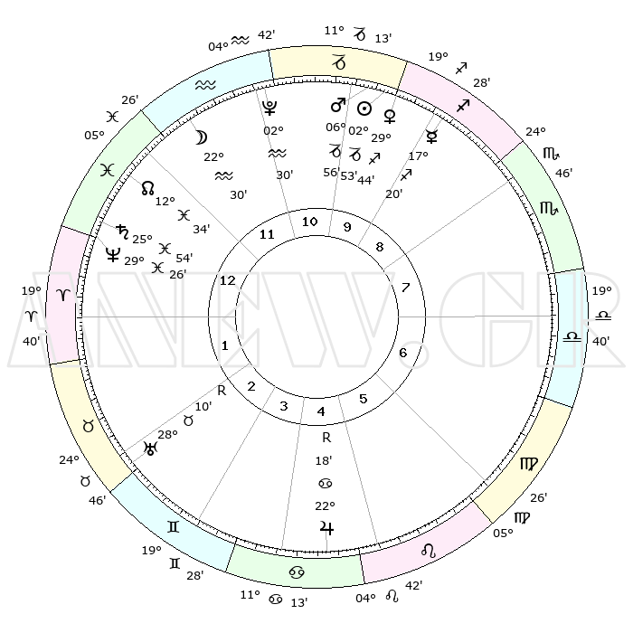 | | ΘΕΣΕΙΣ ΠΛΑΝΗΤΩΝ ΑΣΤΡΟΛΟΓΙΚΟΥ ΧΑΡΤΗ ΤΗΣ ΣΤΙΓΜΗΣ ΑΥΤΗΣ | | | | Πλανήτης | Ζώδιο | Μοίρες | Δεκαήμ. | Σε οίκο | Απόκλιση | | Ακμές των οίκων | | Ηλιος | Αιγόκερως | 02°49' | Πρώτο | 10 | 23 S 24 | | 1ος | 11°13' | Ιχθείς | | Σελήνη | Υδροχόος | 21°40' | Τρίτο | 12 | 15 S 53 | | 2ος | 25°19' | Κριός | | Ερμής | Τοξότης | 17°15' | Δεύτερο | 9 | 22 S 29 | | 3ος | 25°53' | Ταύρος | | Αφροδίτη | Τοξότης | 29°39' | Τρίτο | 10 | 23 S 39 | | 4ος | 19°19' | Δίδυμοι | | Αρης | Αιγόκερως | 06°53' | Πρώτο | 10 | 24 S 06 | | 5ος | 11°04' | Καρκίνος | | Δίας | Καρκίνος | 22°19'R | Τρίτο | 5 | 21 N 48 | | 6ος | 05°53' | Λέων | | Κρόνος | Ιχθείς | 25°53' | Τρίτο | 1 | 03 S 44 | | 7ος | 11°13' | Παρθένος | | Ουρανός | Ταύρος | 28°10'R | Τρίτο | 3 | 19 N 33 | | 8ος | 25°19' | Ζυγός | | Ποσειδώνας | Ιχθείς | 29°26' | Τρίτο | 1 | 01 S 27 | | 9ος | 25°53' | Σκορπιός | | Πλούτωνας | Υδροχόος | 02°30' | Πρώτο | 11 | 23 S 16 | | 10ος | 19°19' | Τοξότης | | Β. Δεσμός | Ιχθείς | 12°34' | Δεύτερο | 1 | 06 S 50 | | 11ος | 11°04' | Αιγόκερως | | Ωροσκόπος | Ιχθείς | 11°13' | Δεύτερο | | | 12ος | 05°53' | Υδροχόος | | Μεσουράνημα | Τοξότης | 19°19' | Δεύτερο | | | |