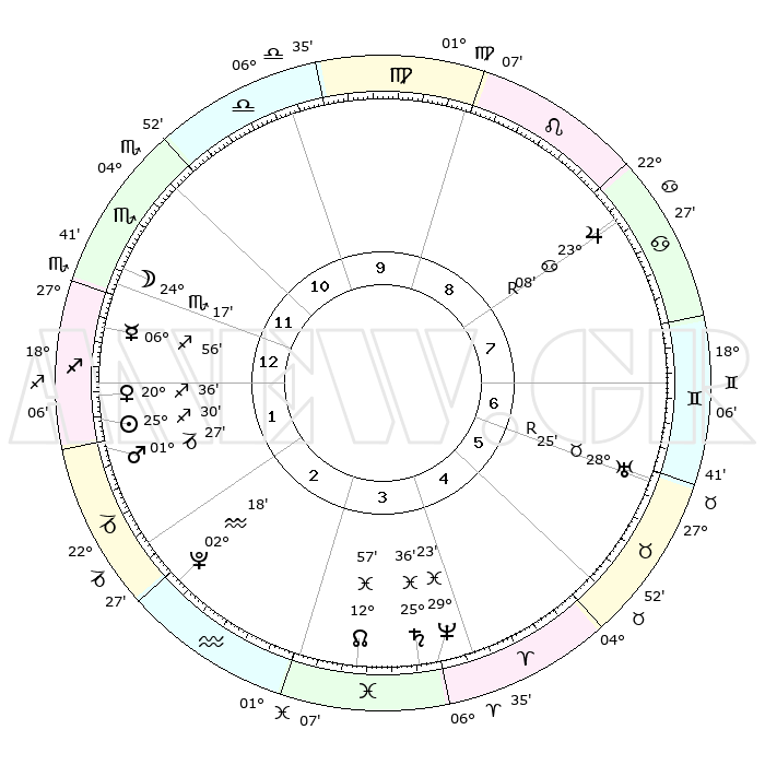 | | ΘΕΣΕΙΣ ΠΛΑΝΗΤΩΝ ΑΣΤΡΟΛΟΓΙΚΟΥ ΧΑΡΤΗ ΤΗΣ ΣΤΙΓΜΗΣ ΑΥΤΗΣ | | | | Πλανήτης | Ζώδιο | Μοίρες | Δεκαήμ. | Σε οίκο | Απόκλιση | | Ακμές των οίκων | | Ηλιος | Τοξότης | 24°44' | Τρίτο | 9 | 23 S 20 | | 1ος | 28°01' | Ιχθείς | | Σελήνη | Σκορπιός | 15°12' | Δεύτερο | 8 | 20 S 38 | | 2ος | 08°47' | Ταύρος | | Ερμής | Τοξότης | 05°53' | Πρώτο | 8 | 19 S 57 | | 3ος | 06°30' | Δίδυμοι | | Αφροδίτη | Τοξότης | 19°38' | Δεύτερο | 9 | 22 S 55 | | 4ος | 28°53' | Δίδυμοι | | Αρης | Αιγόκερως | 00°52' | Πρώτο | 10 | 24 S 13 | | 5ος | 21°07' | Καρκίνος | | Δίας | Καρκίνος | 23°13'R | Τρίτο | 5 | 21 N 38 | | 6ος | 18°13' | Λέων | | Κρόνος | Ιχθείς | 25°35' | Τρίτο | 12 | 03 S 53 | | 7ος | 28°01' | Παρθένος | | Ουρανός | Ταύρος | 28°27'R | Τρίτο | 2 | 19 N 37 | | 8ος | 08°47' | Σκορπιός | | Ποσειδώνας | Ιχθείς | 29°23' | Τρίτο | 1 | 01 S 29 | | 9ος | 06°30' | Τοξότης | | Πλούτωνας | Υδροχόος | 02°17' | Πρώτο | 11 | 23 S 19 | | 10ος | 28°53' | Τοξότης | | Β. Δεσμός | Ιχθείς | 12°60' | Δεύτερο | 12 | 06 S 41 | | 11ος | 21°07' | Αιγόκερως | | Ωροσκόπος | Ιχθείς | 28°01' | Τρίτο | | | 12ος | 18°13' | Υδροχόος | | Μεσουράνημα | Τοξότης | 28°53' | Τρίτο | | | |