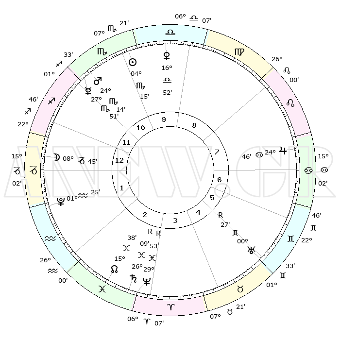 | | ΘΕΣΕΙΣ ΠΛΑΝΗΤΩΝ ΑΣΤΡΟΛΟΓΙΚΟΥ ΧΑΡΤΗ ΤΗΣ ΣΤΙΓΜΗΣ ΑΥΤΗΣ | | | | Πλανήτης | Ζώδιο | Μοίρες | Δεκαήμ. | Σε οίκο | Απόκλιση | | Ακμές των οίκων | | Ηλιος | Σκορπιός | 04°09' | Πρώτο | 11 | 12 S 54 | | 1ος | 12°29' | Τοξότης | | Σελήνη | Αιγόκερως | 07°34' | Πρώτο | 1 | 28 S 01 | | 2ος | 15°40' | Αιγόκερως | | Ερμής | Σκορπιός | 27°45' | Τρίτο | 12 | 22 S 20 | | 3ος | 23°28' | Υδροχόος | | Αφροδίτη | Ζυγός | 16°45' | Δεύτερο | 10 | 05 S 11 | | 4ος | 29°21' | Ιχθείς | | Αρης | Σκορπιός | 24°10' | Τρίτο | 12 | 19 S 09 | | 5ος | 28°34' | Κριός | | Δίας | Καρκίνος | 24°46' | Τρίτο | 8 | 21 N 14 | | 6ος | 22°00' | Ταύρος | | Κρόνος | Ιχθείς | 26°09'R | Τρίτο | 3 | 03 S 48 | | 7ος | 12°29' | Δίδυμοι | | Ουρανός | Δίδυμοι | 00°27'R | Πρώτο | 6 | 20 N 02 | | 8ος | 15°40' | Καρκίνος | | Ποσειδώνας | Ιχθείς | 29°53'R | Τρίτο | 4 | 01 S 18 | | 9ος | 23°28' | Λέων | | Πλούτωνας | Υδροχόος | 01°25' | Πρώτο | 2 | 23 S 31 | | 10ος | 29°21' | Παρθένος | | Β. Δεσμός | Ιχθείς | 15°39' | Δεύτερο | 3 | 05 S 39 | | 11ος | 28°34' | Ζυγός | | Ωροσκόπος | Τοξότης | 12°29' | Δεύτερο | | | 12ος | 22°00' | Σκορπιός | | Μεσουράνημα | Παρθένος | 29°21' | Τρίτο | | | |