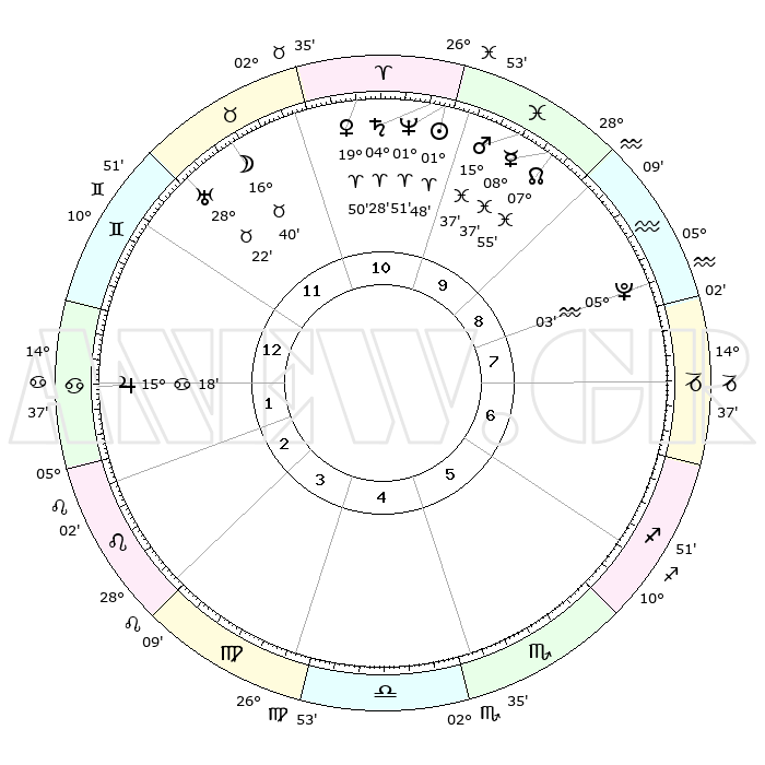 | | ΘΕΣΕΙΣ ΠΛΑΝΗΤΩΝ ΑΣΤΡΟΛΟΓΙΚΟΥ ΧΑΡΤΗ ΤΗΣ ΣΤΙΓΜΗΣ ΑΥΤΗΣ | | | | Πλανήτης | Ζώδιο | Μοίρες | Δεκαήμ. | Σε οίκο | Απόκλιση | | Ακμές των οίκων | | Ηλιος | Κριός | 01°45' | Πρώτο | 10 | 00 N 42 | | 1ος | 24°27' | Δίδυμοι | | Σελήνη | Ταύρος | 15°46' | Δεύτερο | 11 | 21 N 10 | | 2ος | 15°39' | Καρκίνος | | Ερμής | Ιχθείς | 08°37' | Πρώτο | 10 | 07 S 46 | | 3ος | 07°09' | Λέων | | Αφροδίτη | Κριός | 19°46' | Δεύτερο | 11 | 06 N 59 | | 4ος | 02°37' | Παρθένος | | Αρης | Ιχθείς | 15°34' | Δεύτερο | 10 | 06 S 40 | | 5ος | 05°37' | Ζυγός | | Δίας | Καρκίνος | 15°17' | Δεύτερο | 1 | 22 N 55 | | 6ος | 15°53' | Σκορπιός | | Κρόνος | Κριός | 04°28' | Πρώτο | 10 | 00 S 11 | | 7ος | 24°27' | Τοξότης | | Ουρανός | Ταύρος | 28°22' | Τρίτο | 12 | 19 N 37 | | 8ος | 15°39' | Αιγόκερως | | Ποσειδώνας | Κριός | 01°51' | Πρώτο | 10 | 00 S 28 | | 9ος | 07°09' | Υδροχόος | | Πλούτωνας | Υδροχόος | 05°03' | Πρώτο | 8 | 22 S 48 | | 10ος | 02°37' | Ιχθείς | | Β. Δεσμός | Ιχθείς | 07°55' | Πρώτο | 10 | 08 S 36 | | 11ος | 05°37' | Κριός | | Ωροσκόπος | Δίδυμοι | 24°27' | Τρίτο | | | 12ος | 15°53' | Ταύρος | | Μεσουράνημα | Ιχθείς | 02°37' | Πρώτο | | | |
