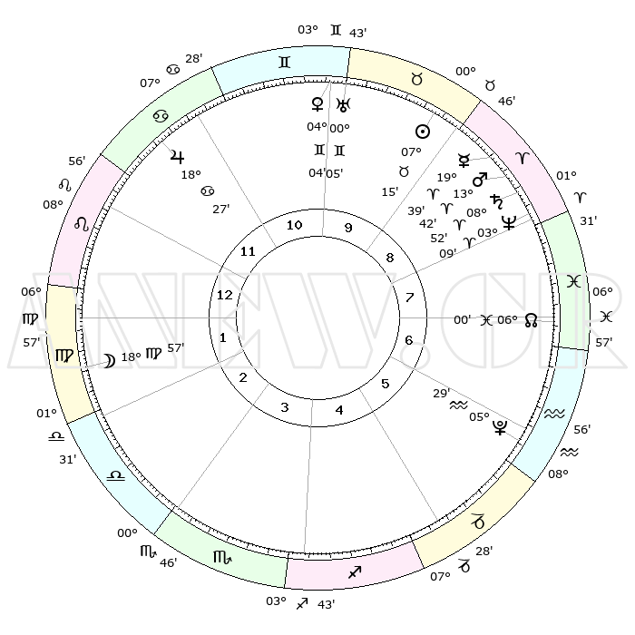 | | ΘΕΣΕΙΣ ΠΛΑΝΗΤΩΝ ΑΣΤΡΟΛΟΓΙΚΟΥ ΧΑΡΤΗ ΤΗΣ ΣΤΙΓΜΗΣ ΑΥΤΗΣ | | | | Πλανήτης | Ζώδιο | Μοίρες | Δεκαήμ. | Σε οίκο | Απόκλιση | | Ακμές των οίκων | | Ηλιος | Ταύρος | 07°12' | Πρώτο | 9 | 13 N 55 | | 1ος | 18°11' | Λέων | | Σελήνη | Παρθένος | 18°07' | Δεύτερο | 2 | 03 N 49 | | 2ος | 10°48' | Παρθένος | | Ερμής | Κριός | 19°32' | Δεύτερο | 9 | 05 N 33 | | 3ος | 08°13' | Ζυγός | | Αφροδίτη | Δίδυμοι | 03°59' | Πρώτο | 10 | 21 N 40 | | 4ος | 10°49' | Σκορπιός | | Αρης | Κριός | 13°39' | Δεύτερο | 9 | 04 N 33 | | 5ος | 15°52' | Τοξότης | | Δίας | Καρκίνος | 18°26' | Δεύτερο | 11 | 22 N 33 | | 6ος | 18°58' | Αιγόκερως | | Κρόνος | Κριός | 08°51' | Πρώτο | 9 | 01 N 31 | | 7ος | 18°11' | Υδροχόος | | Ουρανός | Δίδυμοι | 00°05' | Πρώτο | 10 | 20 N 00 | | 8ος | 10°48' | Ιχθείς | | Ποσειδώνας | Κριός | 03°09' | Πρώτο | 8 | 00 N 03 | | 9ος | 08°14' | Κριός | | Πλούτωνας | Υδροχόος | 05°29' | Πρώτο | 6 | 22 S 48 | | 10ος | 10°49' | Ταύρος | | Β. Δεσμός | Ιχθείς | 06°00' | Πρώτο | 7 | 09 S 18 | | 11ος | 15°52' | Δίδυμοι | | Ωροσκόπος | Λέων | 18°11' | Δεύτερο | | | 12ος | 18°58' | Καρκίνος | | Μεσουράνημα | Ταύρος | 10°49' | Δεύτερο | | | |