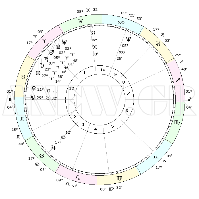 | | ΘΕΣΕΙΣ ΠΛΑΝΗΤΩΝ ΑΣΤΡΟΛΟΓΙΚΟΥ ΧΑΡΤΗ ΤΗΣ ΣΤΙΓΜΗΣ ΑΥΤΗΣ | | | | Πλανήτης | Ζώδιο | Μοίρες | Δεκαήμ. | Σε οίκο | Απόκλιση | | Ακμές των οίκων | | Ηλιος | Κριός | 27°11' | Τρίτο | 12 | 10 N 28 | | 1ος | 08°30' | Ταύρος | | Σελήνη | Κριός | 22°55' | Τρίτο | 12 | 12 N 16 | | 2ος | 08°25' | Δίδυμοι | | Ερμής | Κριός | 02°57' | Πρώτο | 12 | 01 S 15 | | 3ος | 01°10' | Καρκίνος | | Αφροδίτη | Ταύρος | 21°30' | Τρίτο | 1 | 18 N 24 | | 4ος | 22°57' | Καρκίνος | | Αρης | Κριός | 05°44' | Πρώτο | 12 | 01 N 23 | | 5ος | 18°17' | Λέων | | Δίας | Καρκίνος | 17°12' | Δεύτερο | 3 | 22 N 42 | | 6ος | 22°42' | Παρθένος | | Κρόνος | Κριός | 07°39' | Πρώτο | 12 | 01 N 04 | | 7ος | 08°30' | Σκορπιός | | Ουρανός | Ταύρος | 29°32' | Τρίτο | 1 | 19 N 53 | | 8ος | 08°25' | Τοξότης | | Ποσειδώνας | Κριός | 02°48' | Πρώτο | 12 | 00 S 06 | | 9ος | 01°10' | Αιγόκερως | | Πλούτωνας | Υδροχόος | 05°25' | Πρώτο | 10 | 22 S 47 | | 10ος | 22°57' | Αιγόκερως | | Β. Δεσμός | Ιχθείς | 06°33' | Πρώτο | 11 | 09 S 06 | | 11ος | 18°17' | Υδροχόος | | Ωροσκόπος | Ταύρος | 08°30' | Πρώτο | | | 12ος | 22°42' | Ιχθείς | | Μεσουράνημα | Αιγόκερως | 22°57' | Τρίτο | | | |