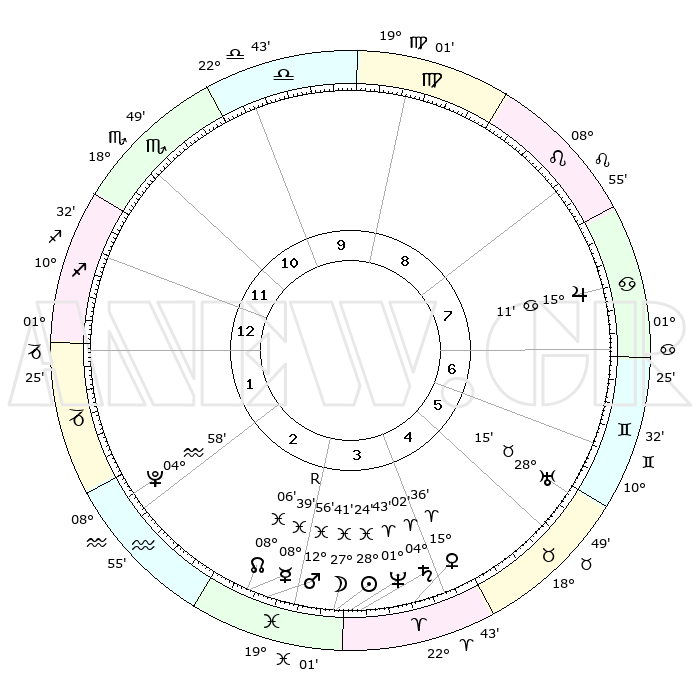 | | ΘΕΣΕΙΣ ΠΛΑΝΗΤΩΝ ΑΣΤΡΟΛΟΓΙΚΟΥ ΧΑΡΤΗ ΤΗΣ ΣΤΙΓΜΗΣ ΑΥΤΗΣ | | | | Πλανήτης | Ζώδιο | Μοίρες | Δεκαήμ. | Σε οίκο | Απόκλιση | | Ακμές των οίκων | | Ηλιος | Ιχθείς | 28°20' | Τρίτο | 4 | 00 S 40 | | 1ος | 11°04' | Τοξότης | | Σελήνη | Ιχθείς | 26°47' | Τρίτο | 3 | 00 N 12 | | 2ος | 13°59' | Αιγόκερως | | Ερμής | Ιχθείς | 08°40'R | Πρώτο | 3 | 06 S 58 | | 3ος | 21°33' | Υδροχόος | | Αφροδίτη | Κριός | 15°31' | Δεύτερο | 4 | 05 N 15 | | 4ος | 27°30' | Ιχθείς | | Αρης | Ιχθείς | 12°53' | Δεύτερο | 3 | 07 S 43 | | 5ος | 26°57' | Κριός | | Δίας | Καρκίνος | 15°11' | Δεύτερο | 8 | 22 N 56 | | 6ος | 20°33' | Ταύρος | | Κρόνος | Κριός | 04°02' | Πρώτο | 4 | 00 S 21 | | 7ος | 11°04' | Δίδυμοι | | Ουρανός | Ταύρος | 28°15' | Τρίτο | 6 | 19 N 36 | | 8ος | 13°59' | Καρκίνος | | Ποσειδώνας | Κριός | 01°43' | Πρώτο | 4 | 00 S 31 | | 9ος | 21°33' | Λέων | | Πλούτωνας | Υδροχόος | 04°58' | Πρώτο | 2 | 22 S 49 | | 10ος | 27°30' | Παρθένος | | Β. Δεσμός | Ιχθείς | 08°06' | Πρώτο | 3 | 08 S 32 | | 11ος | 26°57' | Ζυγός | | Ωροσκόπος | Τοξότης | 11°04' | Δεύτερο | | | 12ος | 20°33' | Σκορπιός | | Μεσουράνημα | Παρθένος | 27°30' | Τρίτο | | | |