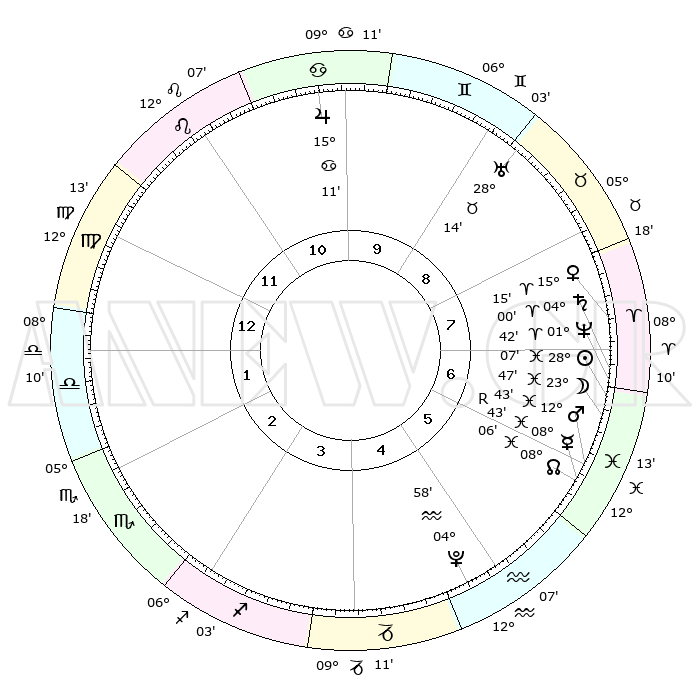| | ΘΕΣΕΙΣ ΠΛΑΝΗΤΩΝ ΑΣΤΡΟΛΟΓΙΚΟΥ ΧΑΡΤΗ ΤΗΣ ΣΤΙΓΜΗΣ ΑΥΤΗΣ | | | | Πλανήτης | Ζώδιο | Μοίρες | Δεκαήμ. | Σε οίκο | Απόκλιση | | Ακμές των οίκων | | Ηλιος | Ιχθείς | 28°03' | Τρίτο | 7 | 00 S 46 | | 1ος | 17°17' | Παρθένος | | Σελήνη | Ιχθείς | 22°48' | Τρίτο | 7 | 01 S 42 | | 2ος | 12°50' | Ζυγός | | Ερμής | Ιχθείς | 08°44'R | Πρώτο | 6 | 06 S 53 | | 3ος | 12°43' | Σκορπιός | | Αφροδίτη | Κριός | 15°10' | Δεύτερο | 8 | 05 N 06 | | 4ος | 15°39' | Τοξότης | | Αρης | Ιχθείς | 12°39' | Δεύτερο | 6 | 07 S 48 | | 5ος | 18°56' | Αιγόκερως | | Δίας | Καρκίνος | 15°11' | Δεύτερο | 10 | 22 N 56 | | 6ος | 19°52' | Υδροχόος | | Κρόνος | Κριός | 03°60' | Πρώτο | 7 | 00 S 22 | | 7ος | 17°17' | Ιχθείς | | Ουρανός | Ταύρος | 28°14' | Τρίτο | 9 | 19 N 36 | | 8ος | 12°50' | Κριός | | Ποσειδώνας | Κριός | 01°42' | Πρώτο | 7 | 00 S 31 | | 9ος | 12°43' | Ταύρος | | Πλούτωνας | Υδροχόος | 04°58' | Πρώτο | 5 | 22 S 49 | | 10ος | 15°39' | Δίδυμοι | | Β. Δεσμός | Ιχθείς | 08°07' | Πρώτο | 6 | 08 S 32 | | 11ος | 18°56' | Καρκίνος | | Ωροσκόπος | Παρθένος | 17°17' | Δεύτερο | | | 12ος | 19°52' | Λέων | | Μεσουράνημα | Δίδυμοι | 15°39' | Δεύτερο | | | |