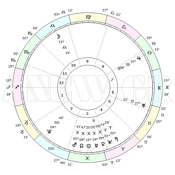 | | ΘΕΣΕΙΣ ΠΛΑΝΗΤΩΝ ΑΣΤΡΟΛΟΓΙΚΟΥ ΧΑΡΤΗ ΤΗΣ ΣΤΙΓΜΗΣ ΑΥΤΗΣ | | | | Πλανήτης | Ζώδιο | Μοίρες | Δεκαήμ. | Σε οίκο | Απόκλιση | | Ακμές των οίκων | | Ηλιος | Ιχθείς | 15°21' | Δεύτερο | 4 | 05 S 46 | | 1ος | 26°29' | Σκορπιός | | Σελήνη | Ζυγός | 14°30' | Δεύτερο | 11 | 08 S 33 | | 2ος | 27°10' | Τοξότης | | Ερμής | Ιχθείς | 18°23'R | Δεύτερο | 4 | 01 S 12 | | 3ος | 02°18' | Υδροχόος | | Αφροδίτη | Ιχθείς | 29°21' | Τρίτο | 4 | 01 S 25 | | 4ος | 08°14' | Ιχθείς | | Αρης | Ιχθείς | 02°38' | Πρώτο | 3 | 11 S 33 | | 5ος | 09°41' | Κριός | | Δίας | Καρκίνος | 15°08'R | Δεύτερο | 8 | 22 N 55 | | 6ος | 05°12' | Ταύρος | | Κρόνος | Κριός | 02°26' | Πρώτο | 4 | 00 S 59 | | 7ος | 26°29' | Ταύρος | | Ουρανός | Ταύρος | 27°51' | Τρίτο | 7 | 19 N 30 | | 8ος | 27°10' | Δίδυμοι | | Ποσειδώνας | Κριός | 01°14' | Πρώτο | 4 | 00 S 43 | | 9ος | 02°18' | Λέων | | Πλούτωνας | Υδροχόος | 04°40' | Πρώτο | 3 | 22 S 51 | | 10ος | 08°14' | Παρθένος | | Β. Δεσμός | Ιχθείς | 08°47' | Πρώτο | 4 | 08 S 16 | | 11ος | 09°41' | Ζυγός | | Ωροσκόπος | Σκορπιός | 26°29' | Τρίτο | | | 12ος | 05°12' | Σκορπιός | | Μεσουράνημα | Παρθένος | 08°14' | Πρώτο | | | |