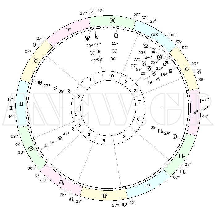 | | ΘΕΣΕΙΣ ΠΛΑΝΗΤΩΝ ΑΣΤΡΟΛΟΓΙΚΟΥ ΧΑΡΤΗ ΤΗΣ ΣΤΙΓΜΗΣ ΑΥΤΗΣ | | | | Πλανήτης | Ζώδιο | Μοίρες | Δεκαήμ. | Σε οίκο | Απόκλιση | | Ακμές των οίκων | | Ηλιος | Αιγόκερως | 23°15' | Τρίτο | 9 | 21 S 26 | | 1ος | 12°08' | Ταύρος | | Σελήνη | Σκορπιός | 23°39' | Τρίτο | 7 | 23 S 26 | | 2ος | 11°06' | Δίδυμοι | | Ερμής | Αιγόκερως | 18°08' | Δεύτερο | 9 | 23 S 53 | | 3ος | 03°33' | Καρκίνος | | Αφροδίτη | Αιγόκερως | 24°53' | Τρίτο | 9 | 22 S 04 | | 4ος | 25°26' | Καρκίνος | | Αρης | Αιγόκερως | 22°17' | Τρίτο | 9 | 22 S 32 | | 5ος | 21°12' | Λέων | | Δίας | Καρκίνος | 19°41'R | Δεύτερο | 3 | 22 N 15 | | 6ος | 26°21' | Παρθένος | | Κρόνος | Ιχθείς | 27°08' | Τρίτο | 12 | 03 S 11 | | 7ος | 12°08' | Σκορπιός | | Ουρανός | Ταύρος | 27°39'R | Τρίτο | 1 | 19 N 27 | | 8ος | 11°06' | Τοξότης | | Ποσειδώνας | Ιχθείς | 29°42' | Τρίτο | 12 | 01 S 20 | | 9ος | 03°33' | Αιγόκερως | | Πλούτωνας | Υδροχόος | 03°07' | Πρώτο | 10 | 23 S 08 | | 10ος | 25°26' | Αιγόκερως | | Β. Δεσμός | Ιχθείς | 11°31' | Δεύτερο | 11 | 07 S 15 | | 11ος | 21°12' | Υδροχόος | | Ωροσκόπος | Ταύρος | 12°08' | Δεύτερο | | | 12ος | 26°21' | Ιχθείς | | Μεσουράνημα | Αιγόκερως | 25°26' | Τρίτο | | | |