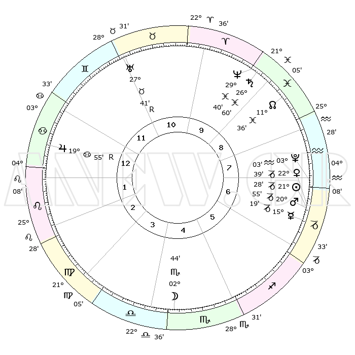 | | ΘΕΣΕΙΣ ΠΛΑΝΗΤΩΝ ΑΣΤΡΟΛΟΓΙΚΟΥ ΧΑΡΤΗ ΤΗΣ ΣΤΙΓΜΗΣ ΑΥΤΗΣ | | | | Πλανήτης | Ζώδιο | Μοίρες | Δεκαήμ. | Σε οίκο | Απόκλιση | | Ακμές των οίκων | | Ηλιος | Αιγόκερως | 21°08' | Τρίτο | 11 | 21 S 46 | | 1ος | 20°46' | Ιχθείς | | Σελήνη | Ζυγός | 28°52' | Τρίτο | 7 | 14 S 40 | | 2ος | 03°08' | Ταύρος | | Ερμής | Αιγόκερως | 14°48' | Δεύτερο | 10 | 24 S 09 | | 3ος | 02°01' | Δίδυμοι | | Αφροδίτη | Αιγόκερως | 22°15' | Τρίτο | 11 | 22 S 27 | | 4ος | 24°48' | Δίδυμοι | | Αρης | Αιγόκερως | 20°40' | Τρίτο | 11 | 22 S 47 | | 5ος | 16°46' | Καρκίνος | | Δίας | Καρκίνος | 19°58'R | Δεύτερο | 5 | 22 N 13 | | 6ος | 12°49' | Λέων | | Κρόνος | Ιχθείς | 26°58' | Τρίτο | 1 | 03 S 15 | | 7ος | 20°46' | Παρθένος | | Ουρανός | Ταύρος | 27°42'R | Τρίτο | 2 | 19 N 27 | | 8ος | 03°08' | Σκορπιός | | Ποσειδώνας | Ιχθείς | 29°40' | Τρίτο | 1 | 01 S 21 | | 9ος | 02°01' | Τοξότης | | Πλούτωνας | Υδροχόος | 03°03' | Πρώτο | 11 | 23 S 09 | | 10ος | 24°48' | Τοξότης | | Β. Δεσμός | Ιχθείς | 11°37' | Δεύτερο | 12 | 07 S 12 | | 11ος | 16°46' | Αιγόκερως | | Ωροσκόπος | Ιχθείς | 20°46' | Τρίτο | | | 12ος | 12°49' | Υδροχόος | | Μεσουράνημα | Τοξότης | 24°48' | Τρίτο | | | |