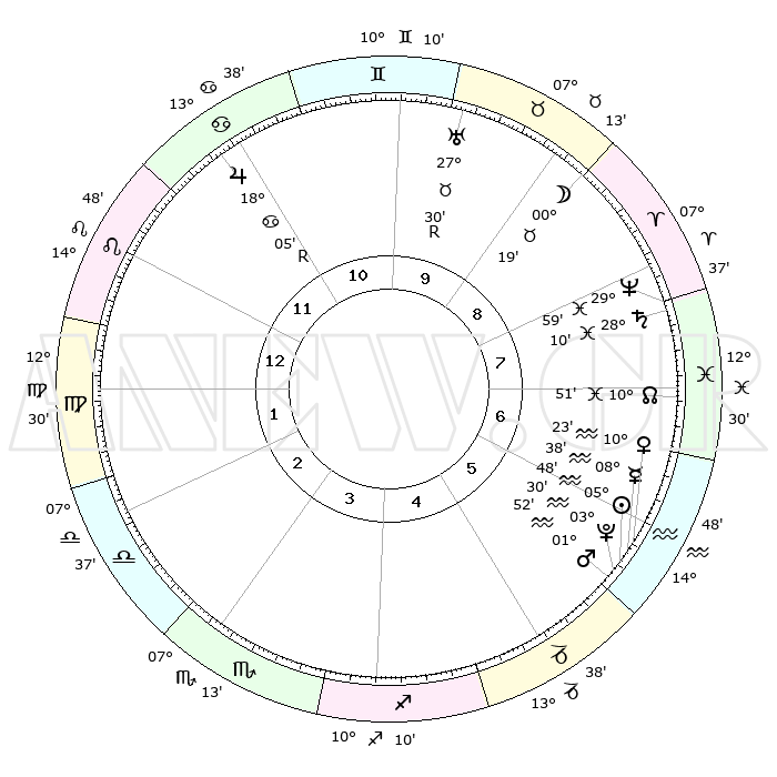 | | ΘΕΣΕΙΣ ΠΛΑΝΗΤΩΝ ΑΣΤΡΟΛΟΓΙΚΟΥ ΧΑΡΤΗ ΤΗΣ ΣΤΙΓΜΗΣ ΑΥΤΗΣ | | | | Πλανήτης | Ζώδιο | Μοίρες | Δεκαήμ. | Σε οίκο | Απόκλιση | | Ακμές των οίκων | | Ηλιος | Υδροχόος | 05°44' | Πρώτο | 6 | 18 S 50 | | 1ος | 23°28' | Λέων | | Σελήνη | Κριός | 29°25' | Τρίτο | 9 | 15 N 00 | | 2ος | 16°38' | Παρθένος | | Ερμής | Υδροχόος | 08°31' | Πρώτο | 6 | 20 S 09 | | 3ος | 14°39' | Ζυγός | | Αφροδίτη | Υδροχόος | 10°18' | Δεύτερο | 6 | 18 S 52 | | 4ος | 17°27' | Σκορπιός | | Αρης | Υδροχόος | 01°49' | Πρώτο | 6 | 20 S 45 | | 5ος | 22°06' | Τοξότης | | Δίας | Καρκίνος | 18°06'R | Δεύτερο | 11 | 22 N 30 | | 6ος | 24°38' | Αιγόκερως | | Κρόνος | Ιχθείς | 28°10' | Τρίτο | 8 | 02 S 44 | | 7ος | 23°28' | Υδροχόος | | Ουρανός | Ταύρος | 27°30'R | Τρίτο | 10 | 19 N 25 | | 8ος | 16°38' | Ιχθείς | | Ποσειδώνας | Ιχθείς | 29°59' | Τρίτο | 8 | 01 S 13 | | 9ος | 14°39' | Κριός | | Πλούτωνας | Υδροχόος | 03°30' | Πρώτο | 6 | 23 S 04 | | 10ος | 17°27' | Ταύρος | | Β. Δεσμός | Ιχθείς | 10°52' | Δεύτερο | 7 | 07 S 30 | | 11ος | 22°06' | Δίδυμοι | | Ωροσκόπος | Λέων | 23°28' | Τρίτο | | | 12ος | 24°38' | Καρκίνος | | Μεσουράνημα | Ταύρος | 17°27' | Δεύτερο | | | |