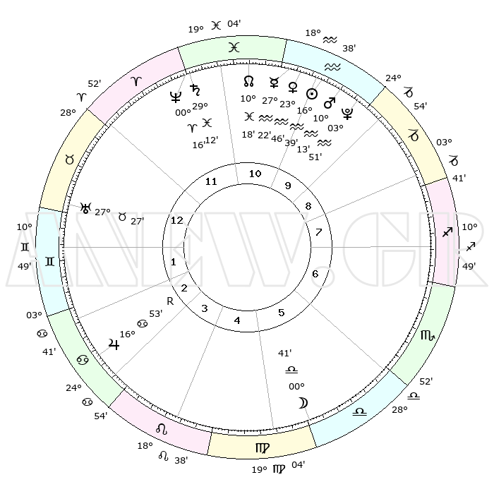| | ΘΕΣΕΙΣ ΠΛΑΝΗΤΩΝ ΑΣΤΡΟΛΟΓΙΚΟΥ ΧΑΡΤΗ ΤΗΣ ΣΤΙΓΜΗΣ ΑΥΤΗΣ | | | | Πλανήτης | Ζώδιο | Μοίρες | Δεκαήμ. | Σε οίκο | Απόκλιση | | Ακμές των οίκων | | Ηλιος | Υδροχόος | 16°34' | Δεύτερο | 10 | 15 S 52 | | 1ος | 11°56' | Ταύρος | | Σελήνη | Παρθένος | 29°50' | Τρίτο | 6 | 01 S 38 | | 2ος | 10°57' | Δίδυμοι | | Ερμής | Υδροχόος | 27°15' | Τρίτο | 11 | 13 S 51 | | 3ος | 03°25' | Καρκίνος | | Αφροδίτη | Υδροχόος | 23°41' | Τρίτο | 11 | 14 S 57 | | 4ος | 25°17' | Καρκίνος | | Αρης | Υδροχόος | 10°10' | Δεύτερο | 10 | 18 S 42 | | 5ος | 21°02' | Λέων | | Δίας | Καρκίνος | 16°53'R | Δεύτερο | 3 | 22 N 41 | | 6ος | 26°09' | Παρθένος | | Κρόνος | Ιχθείς | 29°12' | Τρίτο | 12 | 02 S 18 | | 7ος | 11°56' | Σκορπιός | | Ουρανός | Ταύρος | 27°27' | Τρίτο | 1 | 19 N 24 | | 8ος | 10°57' | Τοξότης | | Ποσειδώνας | Κριός | 00°16' | Πρώτο | 12 | 01 S 06 | | 9ος | 03°25' | Αιγόκερως | | Πλούτωνας | Υδροχόος | 03°50' | Πρώτο | 10 | 23 S 00 | | 10ος | 25°17' | Αιγόκερως | | Β. Δεσμός | Ιχθείς | 10°18' | Δεύτερο | 11 | 07 S 42 | | 11ος | 21°02' | Υδροχόος | | Ωροσκόπος | Ταύρος | 11°56' | Δεύτερο | | | 12ος | 26°09' | Ιχθείς | | Μεσουράνημα | Αιγόκερως | 25°17' | Τρίτο | | | |