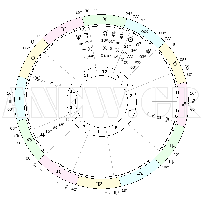| | ΘΕΣΕΙΣ ΠΛΑΝΗΤΩΝ ΑΣΤΡΟΛΟΓΙΚΟΥ ΧΑΡΤΗ ΤΗΣ ΣΤΙΓΜΗΣ ΑΥΤΗΣ | | | | Πλανήτης | Ζώδιο | Μοίρες | Δεκαήμ. | Σε οίκο | Απόκλιση | | Ακμές των οίκων | | Ηλιος | Υδροχόος | 21°39' | Τρίτο | 10 | 14 S 17 | | 1ος | 22°05' | Ταύρος | | Σελήνη | Τοξότης | 01°00' | Πρώτο | 7 | 25 S 27 | | 2ος | 18°36' | Δίδυμοι | | Ερμής | Ιχθείς | 05°57' | Πρώτο | 11 | 10 S 06 | | 3ος | 10°23' | Καρκίνος | | Αφροδίτη | Υδροχόος | 29°58' | Τρίτο | 11 | 12 S 51 | | 4ος | 02°39' | Λέων | | Αρης | Υδροχόος | 14°06' | Δεύτερο | 10 | 17 S 37 | | 5ος | 29°49' | Λέων | | Δίας | Καρκίνος | 16°24'R | Δεύτερο | 3 | 22 N 45 | | 6ος | 06°54' | Ζυγός | | Κρόνος | Ιχθείς | 29°43' | Τρίτο | 11 | 02 S 05 | | 7ος | 22°05' | Σκορπιός | | Ουρανός | Ταύρος | 27°29' | Τρίτο | 1 | 19 N 25 | | 8ος | 18°36' | Τοξότης | | Ποσειδώνας | Κριός | 00°25' | Πρώτο | 11 | 01 S 02 | | 9ος | 10°23' | Αιγόκερως | | Πλούτωνας | Υδροχόος | 03°60' | Πρώτο | 10 | 22 S 58 | | 10ος | 02°39' | Υδροχόος | | Β. Δεσμός | Ιχθείς | 10°02' | Δεύτερο | 11 | 07 S 48 | | 11ος | 29°49' | Υδροχόος | | Ωροσκόπος | Ταύρος | 22°05' | Τρίτο | | | 12ος | 06°54' | Κριός | | Μεσουράνημα | Υδροχόος | 02°39' | Πρώτο | | | |