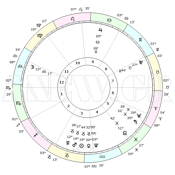 | | ΘΕΣΕΙΣ ΠΛΑΝΗΤΩΝ ΑΣΤΡΟΛΟΓΙΚΟΥ ΧΑΡΤΗ ΤΗΣ ΣΤΙΓΜΗΣ ΑΥΤΗΣ | | | | Πλανήτης | Ζώδιο | Μοίρες | Δεκαήμ. | Σε οίκο | Απόκλιση | | Ακμές των οίκων | | Ηλιος | Αιγόκερως | 19°04' | Δεύτερο | 11 | 22 S 05 | | 1ος | 03°02' | Ιχθείς | | Σελήνη | Ζυγός | 04°09' | Πρώτο | 7 | 03 S 33 | | 2ος | 18°11' | Κριός | | Ερμής | Αιγόκερως | 11°35' | Δεύτερο | 11 | 24 S 18 | | 3ος | 20°18' | Ταύρος | | Αφροδίτη | Αιγόκερως | 19°42' | Δεύτερο | 11 | 22 S 47 | | 4ος | 14°25' | Δίδυμοι | | Αρης | Αιγόκερως | 19°07' | Δεύτερο | 11 | 23 S 00 | | 5ος | 06°06' | Καρκίνος | | Δίας | Καρκίνος | 20°14'R | Τρίτο | 5 | 22 N 10 | | 6ος | 29°58' | Καρκίνος | | Κρόνος | Ιχθείς | 26°49' | Τρίτο | 1 | 03 S 19 | | 7ος | 03°02' | Παρθένος | | Ουρανός | Ταύρος | 27°44'R | Τρίτο | 3 | 19 N 28 | | 8ος | 18°11' | Ζυγός | | Ποσειδώνας | Ιχθείς | 29°38' | Τρίτο | 1 | 01 S 22 | | 9ος | 20°18' | Σκορπιός | | Πλούτωνας | Υδροχόος | 02°59' | Πρώτο | 12 | 23 S 10 | | 10ος | 14°25' | Τοξότης | | Β. Δεσμός | Ιχθείς | 11°44' | Δεύτερο | 1 | 07 S 10 | | 11ος | 06°06' | Αιγόκερως | | Ωροσκόπος | Ιχθείς | 03°02' | Πρώτο | | | 12ος | 29°58' | Αιγόκερως | | Μεσουράνημα | Τοξότης | 14°25' | Δεύτερο | | | |