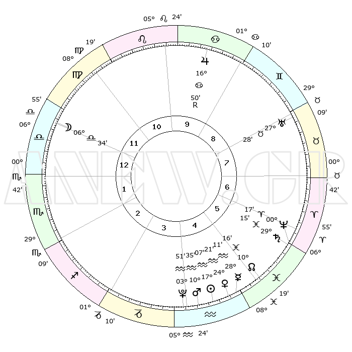 | | ΘΕΣΕΙΣ ΠΛΑΝΗΤΩΝ ΑΣΤΡΟΛΟΓΙΚΟΥ ΧΑΡΤΗ ΤΗΣ ΣΤΙΓΜΗΣ ΑΥΤΗΣ | | | | Πλανήτης | Ζώδιο | Μοίρες | Δεκαήμ. | Σε οίκο | Απόκλιση | | Ακμές των οίκων | | Ηλιος | Υδροχόος | 17°03' | Δεύτερο | 5 | 15 S 43 | | 1ος | 12°25' | Ζυγός | | Σελήνη | Ζυγός | 05°47' | Πρώτο | 12 | 04 S 28 | | 2ος | 09°49' | Σκορπιός | | Ερμής | Υδροχόος | 28°04' | Τρίτο | 5 | 13 S 31 | | 3ος | 10°44' | Τοξότης | | Αφροδίτη | Υδροχόος | 24°16' | Τρίτο | 5 | 14 S 46 | | 4ος | 14°00' | Αιγόκερως | | Αρης | Υδροχόος | 10°32' | Δεύτερο | 4 | 18 S 37 | | 5ος | 16°56' | Υδροχόος | | Δίας | Καρκίνος | 16°50'R | Δεύτερο | 10 | 22 N 41 | | 6ος | 16°50' | Ιχθείς | | Κρόνος | Ιχθείς | 29°15' | Τρίτο | 6 | 02 S 17 | | 7ος | 12°25' | Κριός | | Ουρανός | Ταύρος | 27°28' | Τρίτο | 8 | 19 N 24 | | 8ος | 09°49' | Ταύρος | | Ποσειδώνας | Κριός | 00°17' | Πρώτο | 6 | 01 S 06 | | 9ος | 10°44' | Δίδυμοι | | Πλούτωνας | Υδροχόος | 03°51' | Πρώτο | 4 | 23 S 00 | | 10ος | 14°00' | Καρκίνος | | Β. Δεσμός | Ιχθείς | 10°16' | Δεύτερο | 5 | 07 S 43 | | 11ος | 16°56' | Λέων | | Ωροσκόπος | Ζυγός | 12°25' | Δεύτερο | | | 12ος | 16°50' | Παρθένος | | Μεσουράνημα | Καρκίνος | 14°00' | Δεύτερο | | | |