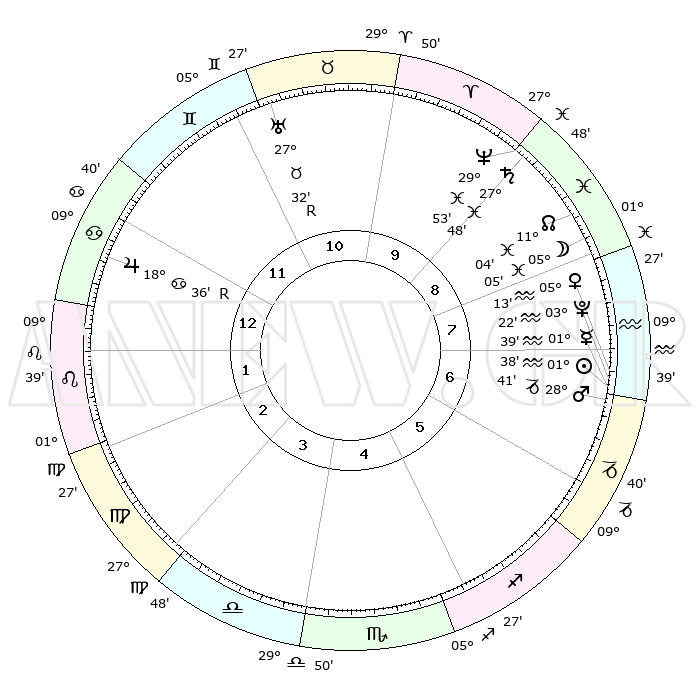 | | ΘΕΣΕΙΣ ΠΛΑΝΗΤΩΝ ΑΣΤΡΟΛΟΓΙΚΟΥ ΧΑΡΤΗ ΤΗΣ ΣΤΙΓΜΗΣ ΑΥΤΗΣ | | | | Πλανήτης | Ζώδιο | Μοίρες | Δεκαήμ. | Σε οίκο | Απόκλιση | | Ακμές των οίκων | | Ηλιος | Υδροχόος | 01°33' | Πρώτο | 7 | 19 S 48 | | 1ος | 16°45' | Καρκίνος | | Σελήνη | Ιχθείς | 04°04' | Πρώτο | 9 | 10 S 28 | | 2ος | 07°12' | Λέων | | Ερμής | Υδροχόος | 01°31' | Πρώτο | 7 | 21 S 49 | | 3ος | 00°33' | Παρθένος | | Αφροδίτη | Υδροχόος | 05°07' | Πρώτο | 7 | 20 S 06 | | 4ος | 29°39' | Παρθένος | | Αρης | Αιγόκερως | 28°37' | Τρίτο | 7 | 21 S 25 | | 5ος | 05°29' | Σκορπιός | | Δίας | Καρκίνος | 18°37'R | Δεύτερο | 1 | 22 N 25 | | 6ος | 13°24' | Τοξότης | | Κρόνος | Ιχθείς | 27°47' | Τρίτο | 9 | 02 S 54 | | 7ος | 16°45' | Αιγόκερως | | Ουρανός | Ταύρος | 27°32'R | Τρίτο | 11 | 19 N 25 | | 8ος | 07°12' | Υδροχόος | | Ποσειδώνας | Ιχθείς | 29°53' | Τρίτο | 10 | 01 S 16 | | 9ος | 00°33' | Ιχθείς | | Πλούτωνας | Υδροχόος | 03°22' | Πρώτο | 7 | 23 S 05 | | 10ος | 29°39' | Ιχθείς | | Β. Δεσμός | Ιχθείς | 11°05' | Δεύτερο | 9 | 07 S 25 | | 11ος | 05°29' | Ταύρος | | Ωροσκόπος | Καρκίνος | 16°45' | Δεύτερο | | | 12ος | 13°24' | Δίδυμοι | | Μεσουράνημα | Ιχθείς | 29°39' | Τρίτο | | | |