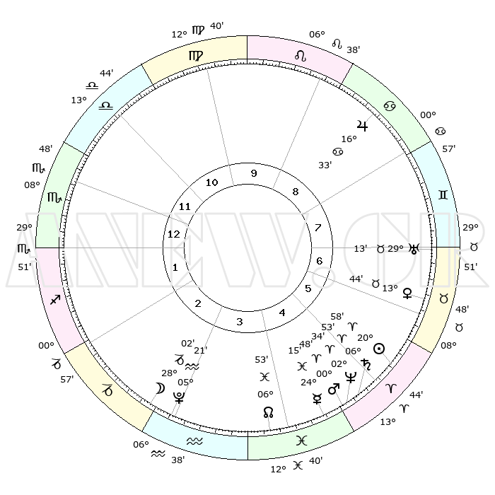 | | ΘΕΣΕΙΣ ΠΛΑΝΗΤΩΝ ΑΣΤΡΟΛΟΓΙΚΟΥ ΧΑΡΤΗ ΤΗΣ ΣΤΙΓΜΗΣ ΑΥΤΗΣ | | | | Πλανήτης | Ζώδιο | Μοίρες | Δεκαήμ. | Σε οίκο | Απόκλιση | | Ακμές των οίκων | | Ηλιος | Κριός | 20°53' | Τρίτο | 6 | 08 N 09 | | 1ος | 07°05' | Σκορπιός | | Σελήνη | Αιγόκερως | 27°05' | Τρίτο | 3 | 24 S 04 | | 2ος | 05°57' | Τοξότης | | Ερμής | Ιχθείς | 24°09' | Τρίτο | 5 | 04 S 31 | | 3ος | 08°32' | Αιγόκερως | | Αφροδίτη | Ταύρος | 13°38' | Δεύτερο | 7 | 15 N 54 | | 4ος | 13°14' | Υδροχόος | | Αρης | Κριός | 00°45' | Πρώτο | 5 | 00 S 38 | | 5ος | 16°00' | Ιχθείς | | Δίας | Καρκίνος | 16°33' | Δεύτερο | 9 | 22 N 47 | | 6ος | 13°58' | Κριός | | Κρόνος | Κριός | 06°52' | Πρώτο | 5 | 00 N 46 | | 7ος | 07°05' | Ταύρος | | Ουρανός | Ταύρος | 29°13' | Τρίτο | 7 | 19 N 49 | | 8ος | 05°57' | Δίδυμοι | | Ποσειδώνας | Κριός | 02°34' | Πρώτο | 5 | 00 S 11 | | 9ος | 08°32' | Καρκίνος | | Πλούτωνας | Υδροχόος | 05°21' | Πρώτο | 3 | 22 S 47 | | 10ος | 13°14' | Λέων | | Β. Δεσμός | Ιχθείς | 06°53' | Πρώτο | 4 | 08 S 59 | | 11ος | 16°00' | Παρθένος | | Ωροσκόπος | Σκορπιός | 07°05' | Πρώτο | | | 12ος | 13°58' | Ζυγός | | Μεσουράνημα | Λέων | 13°14' | Δεύτερο | | | |