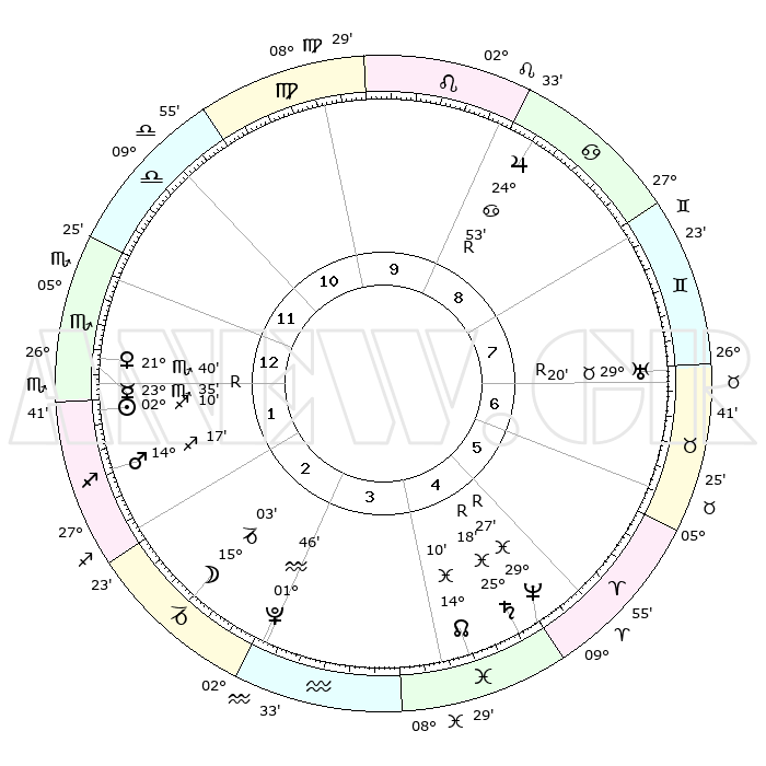 | | ΘΕΣΕΙΣ ΠΛΑΝΗΤΩΝ ΑΣΤΡΟΛΟΓΙΚΟΥ ΧΑΡΤΗ ΤΗΣ ΣΤΙΓΜΗΣ ΑΥΤΗΣ | | | | Πλανήτης | Ζώδιο | Μοίρες | Δεκαήμ. | Σε οίκο | Απόκλιση | | Ακμές των οίκων | | Ηλιος | Τοξότης | 02°08' | Πρώτο | 1 | 20 S 35 | | 1ος | 20°38' | Σκορπιός | | Σελήνη | Αιγόκερως | 14°48' | Δεύτερο | 2 | 26 S 55 | | 2ος | 20°39' | Τοξότης | | Ερμής | Σκορπιός | 23°36'R | Τρίτο | 1 | 17 S 02 | | 3ος | 24°53' | Αιγόκερως | | Αφροδίτη | Σκορπιός | 21°38' | Τρίτο | 1 | 17 S 16 | | 4ος | 00°32' | Ιχθείς | | Αρης | Τοξότης | 14°16' | Δεύτερο | 1 | 23 S 06 | | 5ος | 02°33' | Κριός | | Δίας | Καρκίνος | 24°53'R | Τρίτο | 9 | 21 N 17 | | 6ος | 28°52' | Κριός | | Κρόνος | Ιχθείς | 25°18'R | Τρίτο | 4 | 04 S 04 | | 7ος | 20°38' | Ταύρος | | Ουρανός | Ταύρος | 29°20'R | Τρίτο | 7 | 19 N 48 | | 8ος | 20°39' | Δίδυμοι | | Ποσειδώνας | Ιχθείς | 29°27'R | Τρίτο | 4 | 01 S 28 | | 9ος | 24°53' | Καρκίνος | | Πλούτωνας | Υδροχόος | 01°46' | Πρώτο | 3 | 23 S 26 | | 10ος | 00°32' | Παρθένος | | Β. Δεσμός | Ιχθείς | 14°10' | Δεύτερο | 4 | 06 S 14 | | 11ος | 02°33' | Ζυγός | | Ωροσκόπος | Σκορπιός | 20°38' | Τρίτο | | | 12ος | 28°52' | Ζυγός | | Μεσουράνημα | Παρθένος | 00°32' | Πρώτο | | | |