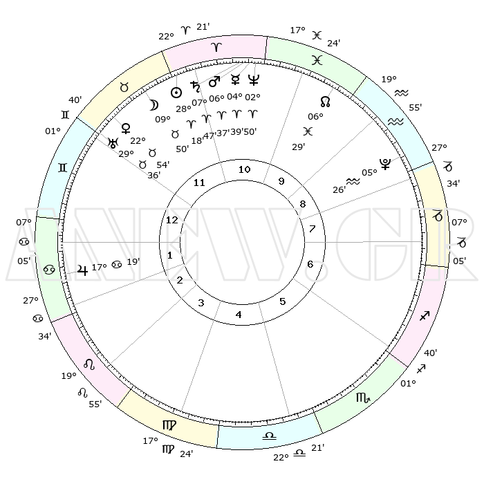 | | ΘΕΣΕΙΣ ΠΛΑΝΗΤΩΝ ΑΣΤΡΟΛΟΓΙΚΟΥ ΧΑΡΤΗ ΤΗΣ ΣΤΙΓΜΗΣ ΑΥΤΗΣ | | | | Πλανήτης | Ζώδιο | Μοίρες | Δεκαήμ. | Σε οίκο | Απόκλιση | | Ακμές των οίκων | | Ηλιος | Κριός | 28°15' | Τρίτο | 11 | 10 N 51 | | 1ος | 14°48' | Δίδυμοι | | Σελήνη | Ταύρος | 08°52' | Πρώτο | 12 | 18 N 41 | | 2ος | 07°05' | Καρκίνος | | Ερμής | Κριός | 04°33' | Πρώτο | 11 | 00 S 37 | | 3ος | 28°19' | Καρκίνος | | Αφροδίτη | Ταύρος | 22°49' | Τρίτο | 12 | 18 N 47 | | 4ος | 22°30' | Λέων | | Αρης | Κριός | 06°34' | Πρώτο | 11 | 01 N 43 | | 5ος | 23°41' | Παρθένος | | Δίας | Καρκίνος | 17°19' | Δεύτερο | 2 | 22 N 41 | | 6ος | 03°47' | Σκορπιός | | Κρόνος | Κριός | 07°47' | Πρώτο | 11 | 01 N 07 | | 7ος | 14°48' | Τοξότης | | Ουρανός | Ταύρος | 29°35' | Τρίτο | 12 | 19 N 54 | | 8ος | 07°05' | Αιγόκερως | | Ποσειδώνας | Κριός | 02°50' | Πρώτο | 11 | 00 S 05 | | 9ος | 28°19' | Αιγόκερως | | Πλούτωνας | Υδροχόος | 05°26' | Πρώτο | 9 | 22 S 47 | | 10ος | 22°30' | Υδροχόος | | Β. Δεσμός | Ιχθείς | 06°29' | Πρώτο | 10 | 09 S 08 | | 11ος | 23°41' | Ιχθείς | | Ωροσκόπος | Δίδυμοι | 14°48' | Δεύτερο | | | 12ος | 03°47' | Ταύρος | | Μεσουράνημα | Υδροχόος | 22°30' | Τρίτο | | | |