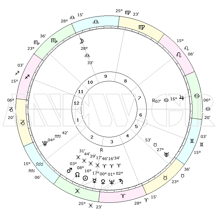 | | ΘΕΣΕΙΣ ΠΛΑΝΗΤΩΝ ΑΣΤΡΟΛΟΓΙΚΟΥ ΧΑΡΤΗ ΤΗΣ ΣΤΙΓΜΗΣ ΑΥΤΗΣ | | | | Πλανήτης | Ζώδιο | Μοίρες | Δεκαήμ. | Σε οίκο | Απόκλιση | | Ακμές των οίκων | | Ηλιος | Ιχθείς | 16°17' | Δεύτερο | 4 | 05 S 25 | | 1ος | 08°34' | Σκορπιός | | Σελήνη | Ζυγός | 26°12' | Τρίτο | 12 | 13 S 43 | | 2ος | 07°32' | Τοξότης | | Ερμής | Ιχθείς | 17°29'R | Δεύτερο | 4 | 01 S 34 | | 3ος | 10°17' | Αιγόκερως | | Αφροδίτη | Κριός | 00°31' | Πρώτο | 5 | 00 S 56 | | 4ος | 15°05' | Υδροχόος | | Αρης | Ιχθείς | 03°22' | Πρώτο | 4 | 11 S 17 | | 5ος | 17°49' | Ιχθείς | | Δίας | Καρκίνος | 15°07'R | Δεύτερο | 9 | 22 N 55 | | 6ος | 15°37' | Κριός | | Κρόνος | Κριός | 02°33' | Πρώτο | 5 | 00 S 56 | | 7ος | 08°34' | Ταύρος | | Ουρανός | Ταύρος | 27°52' | Τρίτο | 7 | 19 N 30 | | 8ος | 07°32' | Δίδυμοι | | Ποσειδώνας | Κριός | 01°16' | Πρώτο | 5 | 00 S 42 | | 9ος | 10°17' | Καρκίνος | | Πλούτωνας | Υδροχόος | 04°41' | Πρώτο | 3 | 22 S 51 | | 10ος | 15°05' | Λέων | | Β. Δεσμός | Ιχθείς | 08°44' | Πρώτο | 4 | 08 S 18 | | 11ος | 17°49' | Παρθένος | | Ωροσκόπος | Σκορπιός | 08°34' | Πρώτο | | | 12ος | 15°37' | Ζυγός | | Μεσουράνημα | Λέων | 15°05' | Δεύτερο | | | |