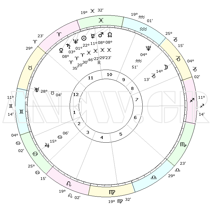 | | ΘΕΣΕΙΣ ΠΛΑΝΗΤΩΝ ΑΣΤΡΟΛΟΓΙΚΟΥ ΧΑΡΤΗ ΤΗΣ ΣΤΙΓΜΗΣ ΑΥΤΗΣ | | | | Πλανήτης | Ζώδιο | Μοίρες | Δεκαήμ. | Σε οίκο | Απόκλιση | | Ακμές των οίκων | | Ηλιος | Ιχθείς | 22°43' | Τρίτο | 11 | 02 S 53 | | 1ος | 17°51' | Ταύρος | | Σελήνη | Αιγόκερως | 13°33' | Δεύτερο | 9 | 27 S 04 | | 2ος | 15°22' | Δίδυμοι | | Ερμής | Ιχθείς | 11°24'R | Δεύτερο | 11 | 04 S 42 | | 3ος | 07°25' | Καρκίνος | | Αφροδίτη | Κριός | 08°31' | Πρώτο | 12 | 02 N 22 | | 4ος | 29°29' | Καρκίνος | | Αρης | Ιχθείς | 08°26' | Πρώτο | 11 | 09 S 25 | | 5ος | 26°02' | Λέων | | Δίας | Καρκίνος | 15°06' | Δεύτερο | 3 | 22 N 56 | | 6ος | 02°18' | Ζυγός | | Κρόνος | Κριός | 03°20' | Πρώτο | 12 | 00 S 38 | | 7ος | 17°51' | Σκορπιός | | Ουρανός | Ταύρος | 28°04' | Τρίτο | 1 | 19 N 33 | | 8ος | 15°22' | Τοξότης | | Ποσειδώνας | Κριός | 01°30' | Πρώτο | 11 | 00 S 36 | | 9ος | 07°25' | Αιγόκερως | | Πλούτωνας | Υδροχόος | 04°51' | Πρώτο | 10 | 22 S 50 | | 10ος | 29°29' | Αιγόκερως | | Β. Δεσμός | Ιχθείς | 08°24' | Πρώτο | 11 | 08 S 25 | | 11ος | 26°02' | Υδροχόος | | Ωροσκόπος | Ταύρος | 17°51' | Δεύτερο | | | 12ος | 02°18' | Κριός | | Μεσουράνημα | Αιγόκερως | 29°29' | Τρίτο | | | |