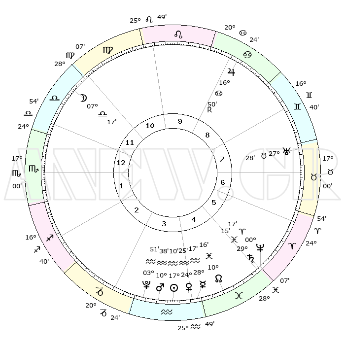 | | ΘΕΣΕΙΣ ΠΛΑΝΗΤΩΝ ΑΣΤΡΟΛΟΓΙΚΟΥ ΧΑΡΤΗ ΤΗΣ ΣΤΙΓΜΗΣ ΑΥΤΗΣ | | | | Πλανήτης | Ζώδιο | Μοίρες | Δεκαήμ. | Σε οίκο | Απόκλιση | | Ακμές των οίκων | | Ηλιος | Υδροχόος | 17°05' | Δεύτερο | 4 | 15 S 43 | | 1ος | 25°14' | Ζυγός | | Σελήνη | Ζυγός | 06°20' | Πρώτο | 12 | 04 S 43 | | 2ος | 23°22' | Σκορπιός | | Ερμής | Υδροχόος | 28°09' | Τρίτο | 4 | 13 S 29 | | 3ος | 24°59' | Τοξότης | | Αφροδίτη | Υδροχόος | 24°19' | Τρίτο | 4 | 14 S 45 | | 4ος | 28°52' | Αιγόκερως | | Αρης | Υδροχόος | 10°34' | Δεύτερο | 4 | 18 S 36 | | 5ος | 01°49' | Ιχθείς | | Δίας | Καρκίνος | 16°50'R | Δεύτερο | 9 | 22 N 41 | | 6ος | 00°53' | Κριός | | Κρόνος | Ιχθείς | 29°15' | Τρίτο | 5 | 02 S 17 | | 7ος | 25°14' | Κριός | | Ουρανός | Ταύρος | 27°28' | Τρίτο | 8 | 19 N 24 | | 8ος | 23°22' | Ταύρος | | Ποσειδώνας | Κριός | 00°17' | Πρώτο | 5 | 01 S 06 | | 9ος | 24°59' | Δίδυμοι | | Πλούτωνας | Υδροχόος | 03°51' | Πρώτο | 4 | 23 S 00 | | 10ος | 28°52' | Καρκίνος | | Β. Δεσμός | Ιχθείς | 10°16' | Δεύτερο | 5 | 07 S 43 | | 11ος | 01°49' | Παρθένος | | Ωροσκόπος | Ζυγός | 25°14' | Τρίτο | | | 12ος | 00°53' | Ζυγός | | Μεσουράνημα | Καρκίνος | 28°52' | Τρίτο | | | |