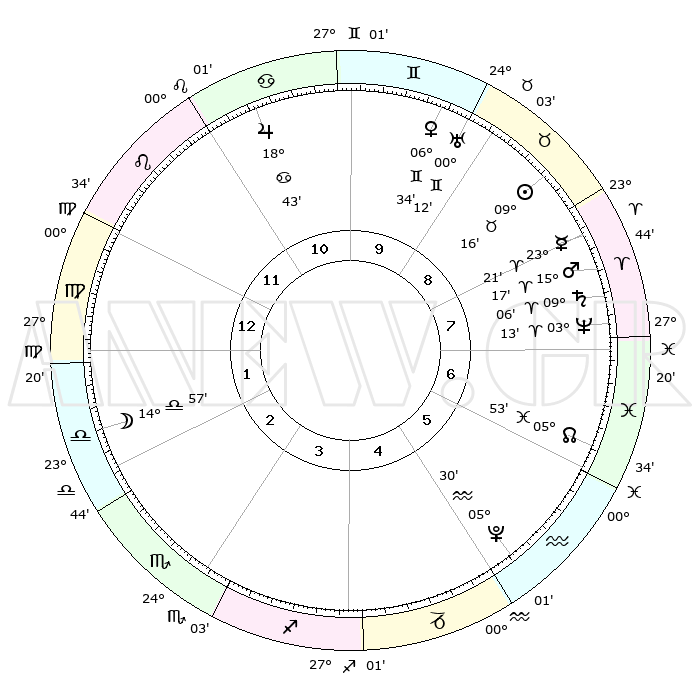 | | ΘΕΣΕΙΣ ΠΛΑΝΗΤΩΝ ΑΣΤΡΟΛΟΓΙΚΟΥ ΧΑΡΤΗ ΤΗΣ ΣΤΙΓΜΗΣ ΑΥΤΗΣ | | | | Πλανήτης | Ζώδιο | Μοίρες | Δεκαήμ. | Σε οίκο | Απόκλιση | | Ακμές των οίκων | | Ηλιος | Ταύρος | 09°13' | Πρώτο | 9 | 14 N 34 | | 1ος | 12°49' | Παρθένος | | Σελήνη | Ζυγός | 14°20' | Δεύτερο | 2 | 08 S 28 | | 2ος | 07°58' | Ζυγός | | Ερμής | Κριός | 23°16' | Τρίτο | 8 | 07 N 06 | | 3ος | 07°36' | Σκορπιός | | Αφροδίτη | Δίδυμοι | 06°30' | Πρώτο | 9 | 22 N 13 | | 4ος | 10°33' | Τοξότης | | Αρης | Κριός | 15°15' | Δεύτερο | 8 | 05 N 11 | | 5ος | 13°60' | Αιγόκερως | | Δίας | Καρκίνος | 18°43' | Δεύτερο | 11 | 22 N 31 | | 6ος | 15°09' | Υδροχόος | | Κρόνος | Κριός | 09°06' | Πρώτο | 8 | 01 N 37 | | 7ος | 12°49' | Ιχθείς | | Ουρανός | Δίδυμοι | 00°12' | Πρώτο | 9 | 20 N 01 | | 8ος | 07°58' | Κριός | | Ποσειδώνας | Κριός | 03°13' | Πρώτο | 7 | 00 N 04 | | 9ος | 07°36' | Ταύρος | | Πλούτωνας | Υδροχόος | 05°30' | Πρώτο | 5 | 22 S 49 | | 10ος | 10°33' | Δίδυμοι | | Β. Δεσμός | Ιχθείς | 05°54' | Πρώτο | 6 | 09 S 21 | | 11ος | 13°60' | Καρκίνος | | Ωροσκόπος | Παρθένος | 12°49' | Δεύτερο | | | 12ος | 15°09' | Λέων | | Μεσουράνημα | Δίδυμοι | 10°33' | Δεύτερο | | | |