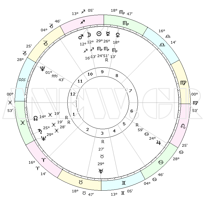 | | ΘΕΣΕΙΣ ΠΛΑΝΗΤΩΝ ΑΣΤΡΟΛΟΓΙΚΟΥ ΧΑΡΤΗ ΤΗΣ ΣΤΙΓΜΗΣ ΑΥΤΗΣ | | | | Πλανήτης | Ζώδιο | Μοίρες | Δεκαήμ. | Σε οίκο | Απόκλιση | | Ακμές των οίκων | | Ηλιος | Σκορπιός | 29°21' | Τρίτο | 10 | 20 S 00 | | 1ος | 10°34' | Υδροχόος | | Σελήνη | Τοξότης | 11°45' | Δεύτερο | 10 | 27 S 08 | | 2ος | 25°59' | Ιχθείς | | Ερμής | Σκορπιός | 26°55'R | Τρίτο | 9 | 18 S 36 | | 3ος | 02°34' | Ταύρος | | Αφροδίτη | Σκορπιός | 18°10' | Δεύτερο | 9 | 16 S 15 | | 4ος | 29°20' | Ταύρος | | Αρης | Τοξότης | 12°15' | Δεύτερο | 10 | 22 S 50 | | 5ος | 21°28' | Δίδυμοι | | Δίας | Καρκίνος | 24°60'R | Τρίτο | 6 | 21 N 16 | | 6ος | 13°25' | Καρκίνος | | Κρόνος | Ιχθείς | 25°19'R | Τρίτο | 1 | 04 S 04 | | 7ος | 10°34' | Λέων | | Ουρανός | Ταύρος | 29°27'R | Τρίτο | 4 | 19 N 49 | | 8ος | 25°59' | Παρθένος | | Ποσειδώνας | Ιχθείς | 29°28'R | Τρίτο | 2 | 01 S 27 | | 9ος | 02°34' | Σκορπιός | | Πλούτωνας | Υδροχόος | 01°43' | Πρώτο | 12 | 23 S 27 | | 10ος | 29°20' | Σκορπιός | | Β. Δεσμός | Ιχθείς | 14°19' | Δεύτερο | 1 | 06 S 10 | | 11ος | 21°29' | Τοξότης | | Ωροσκόπος | Υδροχόος | 10°34' | Δεύτερο | | | 12ος | 13°25' | Αιγόκερως | | Μεσουράνημα | Σκορπιός | 29°20' | Τρίτο | | | |