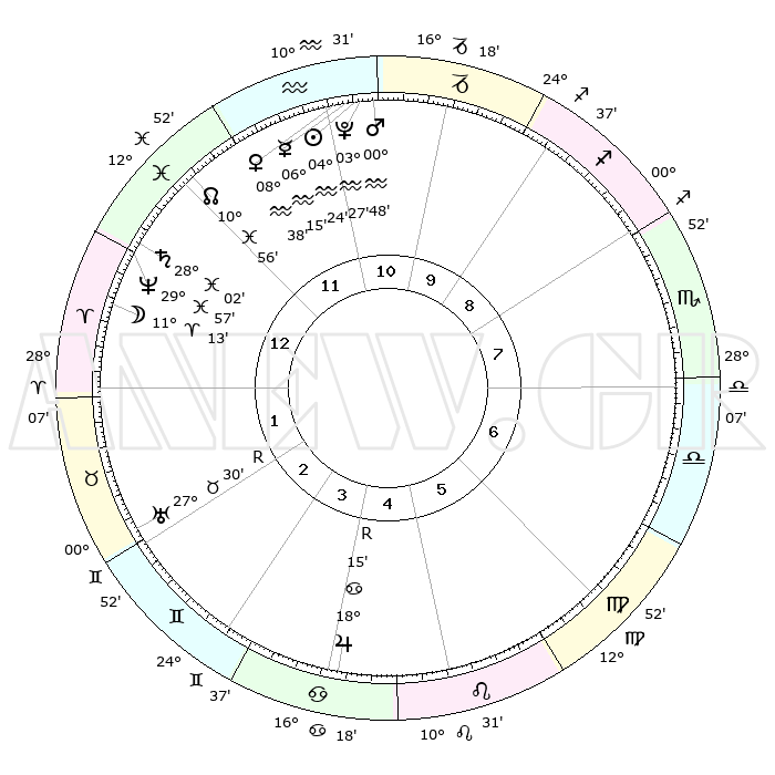 | | ΘΕΣΕΙΣ ΠΛΑΝΗΤΩΝ ΑΣΤΡΟΛΟΓΙΚΟΥ ΧΑΡΤΗ ΤΗΣ ΣΤΙΓΜΗΣ ΑΥΤΗΣ | | | | Πλανήτης | Ζώδιο | Μοίρες | Δεκαήμ. | Σε οίκο | Απόκλιση | | Ακμές των οίκων | | Ηλιος | Υδροχόος | 04°19' | Πρώτο | 11 | 19 S 11 | | 1ος | 12°46' | Ιχθείς | | Σελήνη | Κριός | 10°09' | Δεύτερο | 1 | 06 N 28 | | 2ος | 26°37' | Κριός | | Ερμής | Υδροχόος | 06°07' | Πρώτο | 11 | 20 S 46 | | 3ος | 26°54' | Ταύρος | | Αφροδίτη | Υδροχόος | 08°32' | Πρώτο | 12 | 19 S 18 | | 4ος | 20°13' | Δίδυμοι | | Αρης | Υδροχόος | 00°44' | Πρώτο | 11 | 20 S 59 | | 5ος | 11°59' | Καρκίνος | | Δίας | Καρκίνος | 18°16'R | Δεύτερο | 5 | 22 N 29 | | 6ος | 06°60' | Λέων | | Κρόνος | Ιχθείς | 28°02' | Τρίτο | 1 | 02 S 48 | | 7ος | 12°46' | Παρθένος | | Ουρανός | Ταύρος | 27°30'R | Τρίτο | 3 | 19 N 25 | | 8ος | 26°37' | Ζυγός | | Ποσειδώνας | Ιχθείς | 29°57' | Τρίτο | 1 | 01 S 14 | | 9ος | 26°54' | Σκορπιός | | Πλούτωνας | Υδροχόος | 03°27' | Πρώτο | 11 | 23 S 04 | | 10ος | 20°13' | Τοξότης | | Β. Δεσμός | Ιχθείς | 10°56' | Δεύτερο | 12 | 07 S 28 | | 11ος | 11°59' | Αιγόκερως | | Ωροσκόπος | Ιχθείς | 12°46' | Δεύτερο | | | 12ος | 06°60' | Υδροχόος | | Μεσουράνημα | Τοξότης | 20°13' | Τρίτο | | | |