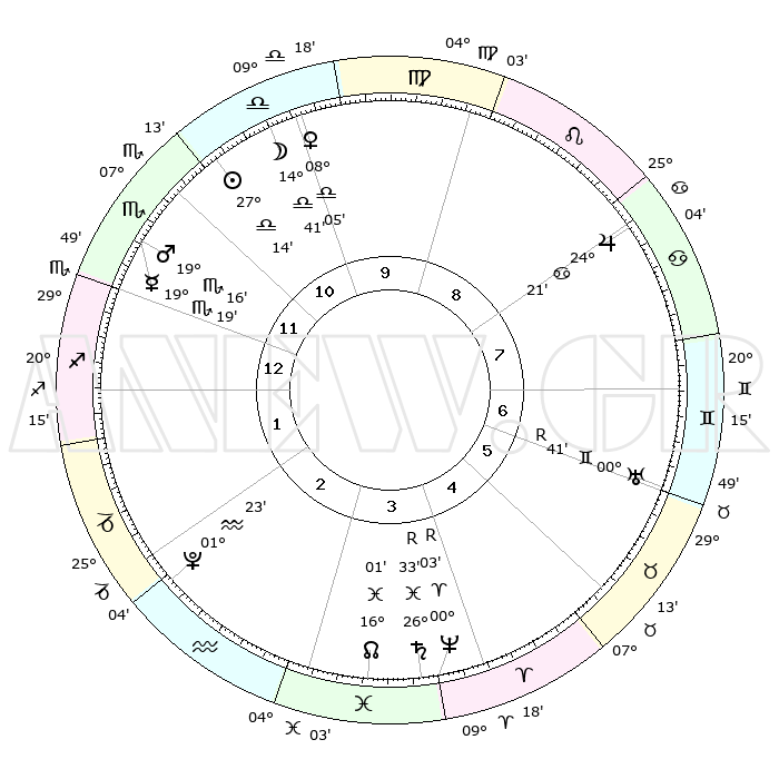 | ΘΕΣΕΙΣ ΠΛΑΝΗΤΩΝ ΑΣΤΡΟΛΟΓΙΚΟΥ ΧΑΡΤΗ ΤΗΣ ΣΤΙΓΜΗΣ ΑΥΤΗΣ | | Πλανήτης | Ζώδιο | Μοίρες | Δεκαήμ. | Σε οίκο | Απόκλιση | | Ακμές των οίκων | Ηλιος | Ζυγός | 27°06' | Τρίτο | 12 | 10 S 26 | | 1ος | 13°29' | Σκορπιός | Σελήνη | Ζυγός | 13°11' | Δεύτερο | 11 | 07 S 14 | | 2ος | 12°49' | Τοξότης | Ερμής | Σκορπιός | 19°09' | Δεύτερο | 1 | 19 S 40 | | 3ος | 16°07' | Αιγόκερως | Αφροδίτη | Ζυγός | 07°55' | Πρώτο | 11 | 01 S 44 | | 4ος | 21°17' | Υδροχόος | Αρης | Σκορπιός | 19°10' | Δεύτερο | 1 | 17 S 47 | | 5ος | 23°48' | Ιχθείς | Δίας | Καρκίνος | 24°20' | Τρίτο | 9 | 21 N 18 | | 6ος | 21°01' | Κριός | Κρόνος | Ιχθείς | 26°33'R | Τρίτο | 5 | 03 S 39 | | 7ος | 13°29' | Ταύρος | Ουρανός | Δίδυμοι | 00°41'R | Πρώτο | 7 | 20 N 05 | | 8ος | 12°50' | Δίδυμοι | Ποσειδώνας | Κριός | 00°03'R | Πρώτο | 5 | 01 S 14 | | 9ος | 16°07' | Καρκίνος | Πλούτωνας | Υδροχόος | 01°23' | Πρώτο | 3 | 23 S 32 | | 10ος | 21°17' | Λέων | Β. Δεσμός | Ιχθείς | 16°01' | Δεύτερο | 4 | 05 S 31 | | 11ος | 23°48' | Παρθένος | Ωροσκόπος | Σκορπιός | 13°29' | Δεύτερο | | | 12ος | 21°01' | Ζυγός | Μεσουράνημα | Λέων | 21°17' | Τρίτο | | | |