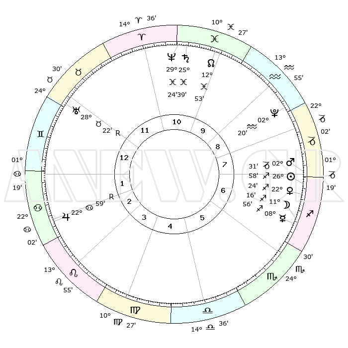 | | ΘΕΣΕΙΣ ΠΛΑΝΗΤΩΝ ΑΣΤΡΟΛΟΓΙΚΟΥ ΧΑΡΤΗ ΤΗΣ ΣΤΙΓΜΗΣ ΑΥΤΗΣ | | | | Πλανήτης | Ζώδιο | Μοίρες | Δεκαήμ. | Σε οίκο | Απόκλιση | | Ακμές των οίκων | | Ηλιος | Τοξότης | 26°29' | Τρίτο | 1 | 23 S 23 | | 1ος | 05°31' | Τοξότης | | Σελήνη | Τοξότης | 05°38' | Πρώτο | 1 | 26 S 07 | | 2ος | 07°28' | Αιγόκερως | | Ερμής | Τοξότης | 08°16' | Πρώτο | 1 | 20 S 34 | | 3ος | 14°06' | Υδροχόος | | Αφροδίτη | Τοξότης | 21°49' | Τρίτο | 1 | 23 S 09 | | 4ος | 20°12' | Ιχθείς | | Αρης | Αιγόκερως | 02°10' | Πρώτο | 1 | 24 S 13 | | 5ος | 20°29' | Κριός | | Δίας | Καρκίνος | 23°02'R | Τρίτο | 8 | 21 N 40 | | 6ος | 14°48' | Ταύρος | | Κρόνος | Ιχθείς | 25°38' | Τρίτο | 4 | 03 S 51 | | 7ος | 05°31' | Δίδυμοι | | Ουρανός | Ταύρος | 28°23'R | Τρίτο | 6 | 19 N 36 | | 8ος | 07°28' | Καρκίνος | | Ποσειδώνας | Ιχθείς | 29°23' | Τρίτο | 4 | 01 S 28 | | 9ος | 14°06' | Λέων | | Πλούτωνας | Υδροχόος | 02°20' | Πρώτο | 2 | 23 S 18 | | 10ος | 20°12' | Παρθένος | | Β. Δεσμός | Ιχθείς | 12°54' | Δεύτερο | 3 | 06 S 43 | | 11ος | 20°29' | Ζυγός | | Ωροσκόπος | Τοξότης | 05°31' | Πρώτο | | | 12ος | 14°48' | Σκορπιός | | Μεσουράνημα | Παρθένος | 20°12' | Τρίτο | | | |