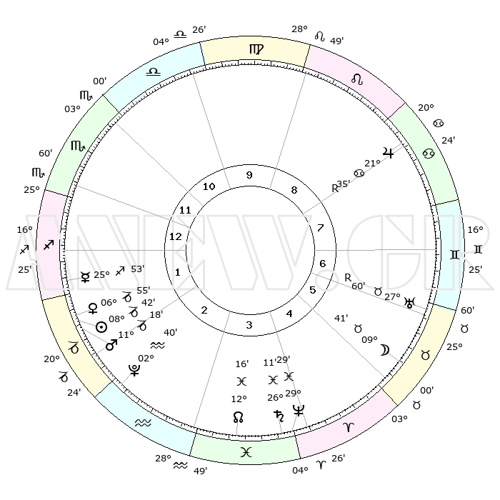 | | ΘΕΣΕΙΣ ΠΛΑΝΗΤΩΝ ΑΣΤΡΟΛΟΓΙΚΟΥ ΧΑΡΤΗ ΤΗΣ ΣΤΙΓΜΗΣ ΑΥΤΗΣ | | | | Πλανήτης | Ζώδιο | Μοίρες | Δεκαήμ. | Σε οίκο | Απόκλιση | | Ακμές των οίκων | | Ηλιος | Αιγόκερως | 08°38' | Πρώτο | 2 | 23 S 09 | | 1ος | 24°10' | Σκορπιός | | Σελήνη | Ταύρος | 08°36' | Πρώτο | 6 | 18 N 25 | | 2ος | 24°34' | Τοξότης | | Ερμής | Τοξότης | 25°46' | Τρίτο | 2 | 23 S 43 | | 3ος | 29°20' | Αιγόκερως | | Αφροδίτη | Αιγόκερως | 06°49' | Πρώτο | 2 | 23 S 41 | | 4ος | 05°10' | Ιχθείς | | Αρης | Αιγόκερως | 11°14' | Δεύτερο | 2 | 23 S 50 | | 5ος | 06°51' | Κριός | | Δίας | Καρκίνος | 21°36'R | Τρίτο | 8 | 21 N 56 | | 6ος | 02°42' | Ταύρος | | Κρόνος | Ιχθείς | 26°11' | Τρίτο | 4 | 03 S 36 | | 7ος | 24°10' | Ταύρος | | Ουρανός | Ταύρος | 27°60'R | Τρίτο | 7 | 19 N 31 | | 8ος | 24°34' | Δίδυμοι | | Ποσειδώνας | Ιχθείς | 29°29' | Τρίτο | 4 | 01 S 26 | | 9ος | 29°20' | Καρκίνος | | Πλούτωνας | Υδροχόος | 02°40' | Πρώτο | 3 | 23 S 14 | | 10ος | 05°10' | Παρθένος | | Β. Δεσμός | Ιχθείς | 12°16' | Δεύτερο | 4 | 06 S 57 | | 11ος | 06°51' | Ζυγός | | Ωροσκόπος | Σκορπιός | 24°10' | Τρίτο | | | 12ος | 02°42' | Σκορπιός | | Μεσουράνημα | Παρθένος | 05°10' | Πρώτο | | | |