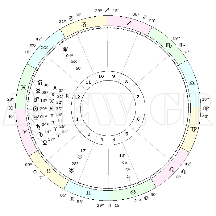 | | ΘΕΣΕΙΣ ΠΛΑΝΗΤΩΝ ΑΣΤΡΟΛΟΓΙΚΟΥ ΧΑΡΤΗ ΤΗΣ ΣΤΙΓΜΗΣ ΑΥΤΗΣ | | | | Πλανήτης | Ζώδιο | Μοίρες | Δεκαήμ. | Σε οίκο | Απόκλιση | | Ακμές των οίκων | | Ηλιος | Ιχθείς | 29°30' | Τρίτο | 1 | 00 S 12 | | 1ος | 15°50' | Υδροχόος | | Σελήνη | Κριός | 13°18' | Δεύτερο | 2 | 07 N 59 | | 2ος | 01°33' | Κριός | | Ερμής | Ιχθείς | 08°31'R | Πρώτο | 1 | 07 S 18 | | 3ος | 07°07' | Ταύρος | | Αφροδίτη | Κριός | 16°58' | Δεύτερο | 2 | 05 N 51 | | 4ος | 03°09' | Δίδυμοι | | Αρης | Ιχθείς | 13°48' | Δεύτερο | 1 | 07 S 22 | | 5ος | 25°05' | Δίδυμοι | | Δίας | Καρκίνος | 15°13' | Δεύτερο | 5 | 22 N 56 | | 6ος | 17°23' | Καρκίνος | | Κρόνος | Κριός | 04°11' | Πρώτο | 2 | 00 S 17 | | 7ος | 15°50' | Λέων | | Ουρανός | Ταύρος | 28°17' | Τρίτο | 3 | 19 N 36 | | 8ος | 01°33' | Ζυγός | | Ποσειδώνας | Κριός | 01°46' | Πρώτο | 2 | 00 S 30 | | 9ος | 07°07' | Σκορπιός | | Πλούτωνας | Υδροχόος | 04°60' | Πρώτο | 12 | 22 S 49 | | 10ος | 03°09' | Τοξότης | | Β. Δεσμός | Ιχθείς | 08°02' | Πρώτο | 1 | 08 S 33 | | 11ος | 25°05' | Τοξότης | | Ωροσκόπος | Υδροχόος | 15°50' | Δεύτερο | | | 12ος | 17°23' | Αιγόκερως | | Μεσουράνημα | Τοξότης | 03°09' | Πρώτο | | | |