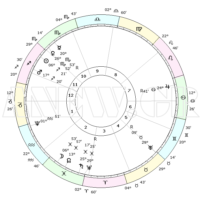 | | ΘΕΣΕΙΣ ΠΛΑΝΗΤΩΝ ΑΣΤΡΟΛΟΓΙΚΟΥ ΧΑΡΤΗ ΤΗΣ ΣΤΙΓΜΗΣ ΑΥΤΗΣ | | | | Πλανήτης | Ζώδιο | Μοίρες | Δεκαήμ. | Σε οίκο | Απόκλιση | | Ακμές των οίκων | | Ηλιος | Τοξότης | 06°19' | Πρώτο | 11 | 21 S 21 | | 1ος | 02°57' | Αιγόκερως | | Σελήνη | Ιχθείς | 06°32' | Πρώτο | 2 | 09 S 45 | | 2ος | 10°51' | Υδροχόος | | Ερμής | Σκορπιός | 20°54'R | Τρίτο | 11 | 15 S 38 | | 3ος | 21°01' | Ιχθείς | | Αφροδίτη | Σκορπιός | 26°50' | Τρίτο | 11 | 18 S 40 | | 4ος | 24°28' | Κριός | | Αρης | Τοξότης | 17°19' | Δεύτερο | 12 | 23 S 28 | | 5ος | 20°20' | Ταύρος | | Δίας | Καρκίνος | 24°41'R | Τρίτο | 7 | 21 N 20 | | 6ος | 11°57' | Δίδυμοι | | Κρόνος | Ιχθείς | 25°17'R | Τρίτο | 3 | 04 S 04 | | 7ος | 02°57' | Καρκίνος | | Ουρανός | Ταύρος | 29°09'R | Τρίτο | 5 | 19 N 46 | | 8ος | 10°51' | Λέων | | Ποσειδώνας | Ιχθείς | 29°25'R | Τρίτο | 3 | 01 S 29 | | 9ος | 21°01' | Παρθένος | | Πλούτωνας | Υδροχόος | 01°51' | Πρώτο | 1 | 23 S 25 | | 10ος | 24°28' | Ζυγός | | Β. Δεσμός | Ιχθείς | 13°57' | Δεύτερο | 2 | 06 S 19 | | 11ος | 20°20' | Σκορπιός | | Ωροσκόπος | Αιγόκερως | 02°57' | Πρώτο | | | 12ος | 11°57' | Τοξότης | | Μεσουράνημα | Ζυγός | 24°28' | Τρίτο | | | |