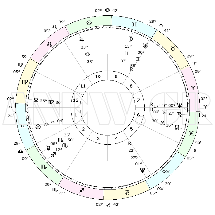 | ΘΕΣΕΙΣ ΠΛΑΝΗΤΩΝ ΑΣΤΡΟΛΟΓΙΚΟΥ ΧΑΡΤΗ ΤΗΣ ΣΤΙΓΜΗΣ ΑΥΤΗΣ | | Πλανήτης | Ζώδιο | Μοίρες | Δεκαήμ. | Σε οίκο | Απόκλιση | | Ακμές των οίκων | Ηλιος | Ζυγός | 17°53' | Δεύτερο | 3 | 07 S 01 | | 1ος | 06°01' | Λέων | Σελήνη | Δίδυμοι | 10°43' | Δεύτερο | 11 | 27 N 10 | | 2ος | 27°31' | Λέων | Ερμής | Σκορπιός | 06°18' | Πρώτο | 4 | 14 S 50 | | 3ος | 23°23' | Παρθένος | Αφροδίτη | Παρθένος | 26°22' | Τρίτο | 3 | 02 N 48 | | 4ος | 25°05' | Ζυγός | Αρης | Σκορπιός | 12°42' | Δεύτερο | 4 | 15 S 49 | | 5ος | 00°55' | Τοξότης | Δίας | Καρκίνος | 23°33' | Τρίτο | 12 | 21 N 25 | | 6ος | 05°39' | Αιγόκερως | Κρόνος | Ιχθείς | 27°10'R | Τρίτο | 9 | 03 S 26 | | 7ος | 06°01' | Υδροχόος | Ουρανός | Δίδυμοι | 00°58'R | Πρώτο | 11 | 20 N 08 | | 8ος | 27°31' | Υδροχόος | Ποσειδώνας | Κριός | 00°17'R | Πρώτο | 9 | 01 S 09 | | 9ος | 23°23' | Ιχθείς | Πλούτωνας | Υδροχόος | 01°22'R | Πρώτο | 6 | 23 S 32 | | 10ος | 25°05' | Κριός | Β. Δεσμός | Ιχθείς | 16°31' | Δεύτερο | 8 | 05 S 19 | | 11ος | 00°55' | Δίδυμοι | Ωροσκόπος | Λέων | 06°01' | Πρώτο | | | 12ος | 05°39' | Καρκίνος | Μεσουράνημα | Κριός | 25°05' | Τρίτο | | | |