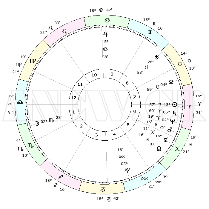 | | ΘΕΣΕΙΣ ΠΛΑΝΗΤΩΝ ΑΣΤΡΟΛΟΓΙΚΟΥ ΧΑΡΤΗ ΤΗΣ ΣΤΙΓΜΗΣ ΑΥΤΗΣ | | | | Πλανήτης | Ζώδιο | Μοίρες | Δεκαήμ. | Σε οίκο | Απόκλιση | | Ακμές των οίκων | | Ηλιος | Κριός | 13°53' | Δεύτερο | 7 | 05 N 29 | | 1ος | 26°53' | Παρθένος | | Σελήνη | Σκορπιός | 01°39' | Πρώτο | 2 | 15 S 55 | | 2ος | 23°14' | Ζυγός | | Ερμής | Ιχθείς | 16°07' | Δεύτερο | 6 | 07 S 02 | | 3ος | 23°33' | Σκορπιός | | Αφροδίτη | Ταύρος | 04°54' | Πρώτο | 8 | 12 N 50 | | 4ος | 26°30' | Τοξότης | | Αρης | Ιχθείς | 25°11' | Τρίτο | 6 | 02 S 52 | | 5ος | 29°31' | Αιγόκερως | | Δίας | Καρκίνος | 15°58' | Δεύτερο | 10 | 22 N 51 | | 6ος | 00°04' | Ιχθείς | | Κρόνος | Κριός | 05°59' | Πρώτο | 7 | 00 N 25 | | 7ος | 26°53' | Ιχθείς | | Ουρανός | Ταύρος | 28°53' | Τρίτο | 9 | 19 N 44 | | 8ος | 23°14' | Κριός | | Ποσειδώνας | Κριός | 02°19' | Πρώτο | 7 | 00 S 17 | | 9ος | 23°33' | Ταύρος | | Πλούτωνας | Υδροχόος | 05°15' | Πρώτο | 5 | 22 S 47 | | 10ος | 26°30' | Δίδυμοι | | Β. Δεσμός | Ιχθείς | 07°16' | Πρώτο | 6 | 08 S 50 | | 11ος | 29°31' | Καρκίνος | | Ωροσκόπος | Παρθένος | 26°53' | Τρίτο | | | 12ος | 00°04' | Παρθένος | | Μεσουράνημα | Δίδυμοι | 26°30' | Τρίτο | | | |