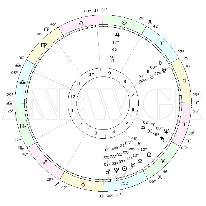 | | ΘΕΣΕΙΣ ΠΛΑΝΗΤΩΝ ΑΣΤΡΟΛΟΓΙΚΟΥ ΧΑΡΤΗ ΤΗΣ ΣΤΙΓΜΗΣ ΑΥΤΗΣ | | | | Πλανήτης | Ζώδιο | Μοίρες | Δεκαήμ. | Σε οίκο | Απόκλιση | | Ακμές των οίκων | | Ηλιος | Υδροχόος | 07°56' | Πρώτο | 4 | 18 S 17 | | 1ος | 09°53' | Ζυγός | | Σελήνη | Ταύρος | 29°54' | Τρίτο | 8 | 25 N 08 | | 2ος | 07°08' | Σκορπιός | | Ερμής | Υδροχόος | 12°14' | Δεύτερο | 4 | 19 S 06 | | 3ος | 07°57' | Τοξότης | | Αφροδίτη | Υδροχόος | 12°60' | Δεύτερο | 4 | 18 S 09 | | 4ος | 11°08' | Αιγόκερως | | Αρης | Υδροχόος | 03°30' | Πρώτο | 4 | 20 S 22 | | 5ος | 14°03' | Υδροχόος | | Δίας | Καρκίνος | 17°50'R | Δεύτερο | 10 | 22 N 32 | | 6ος | 14°05' | Ιχθείς | | Κρόνος | Ιχθείς | 28°21' | Τρίτο | 6 | 02 S 39 | | 7ος | 09°53' | Κριός | | Ουρανός | Ταύρος | 27°29'R | Τρίτο | 8 | 19 N 24 | | 8ος | 07°08' | Ταύρος | | Ποσειδώνας | Κριός | 00°02' | Πρώτο | 6 | 01 S 12 | | 9ος | 07°57' | Δίδυμοι | | Πλούτωνας | Υδροχόος | 03°34' | Πρώτο | 4 | 23 S 03 | | 10ος | 11°08' | Καρκίνος | | Β. Δεσμός | Ιχθείς | 10°45' | Δεύτερο | 5 | 07 S 32 | | 11ος | 14°03' | Λέων | | Ωροσκόπος | Ζυγός | 09°53' | Πρώτο | | | 12ος | 14°05' | Παρθένος | | Μεσουράνημα | Καρκίνος | 11°08' | Δεύτερο | | | |