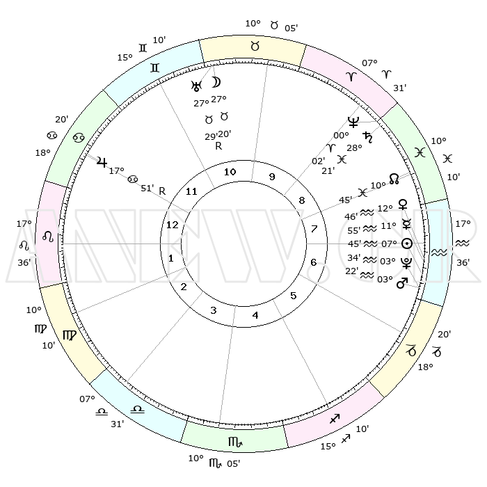 | | ΘΕΣΕΙΣ ΠΛΑΝΗΤΩΝ ΑΣΤΡΟΛΟΓΙΚΟΥ ΧΑΡΤΗ ΤΗΣ ΣΤΙΓΜΗΣ ΑΥΤΗΣ | | | | Πλανήτης | Ζώδιο | Μοίρες | Δεκαήμ. | Σε οίκο | Απόκλιση | | Ακμές των οίκων | | Ηλιος | Υδροχόος | 07°41' | Πρώτο | 7 | 18 S 21 | | 1ος | 29°28' | Καρκίνος | | Σελήνη | Ταύρος | 26°26' | Τρίτο | 11 | 24 N 17 | | 2ος | 20°28' | Λέων | | Ερμής | Υδροχόος | 11°49' | Δεύτερο | 7 | 19 S 13 | | 3ος | 15°26' | Παρθένος | | Αφροδίτη | Υδροχόος | 12°42' | Δεύτερο | 7 | 18 S 14 | | 4ος | 16°24' | Ζυγός | | Αρης | Υδροχόος | 03°19' | Πρώτο | 7 | 20 S 24 | | 5ος | 22°28' | Σκορπιός | | Δίας | Καρκίνος | 17°52'R | Δεύτερο | 12 | 22 N 32 | | 6ος | 28°15' | Τοξότης | | Κρόνος | Ιχθείς | 28°20' | Τρίτο | 9 | 02 S 40 | | 7ος | 29°28' | Αιγόκερως | | Ουρανός | Ταύρος | 27°29'R | Τρίτο | 11 | 19 N 24 | | 8ος | 20°28' | Υδροχόος | | Ποσειδώνας | Κριός | 00°02' | Πρώτο | 9 | 01 S 12 | | 9ος | 15°26' | Ιχθείς | | Πλούτωνας | Υδροχόος | 03°34' | Πρώτο | 7 | 23 S 03 | | 10ος | 16°24' | Κριός | | Β. Δεσμός | Ιχθείς | 10°46' | Δεύτερο | 8 | 07 S 32 | | 11ος | 22°28' | Ταύρος | | Ωροσκόπος | Καρκίνος | 29°28' | Τρίτο | | | 12ος | 28°15' | Δίδυμοι | | Μεσουράνημα | Κριός | 16°24' | Δεύτερο | | | |