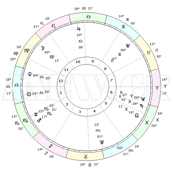 | ΘΕΣΕΙΣ ΠΛΑΝΗΤΩΝ ΑΣΤΡΟΛΟΓΙΚΟΥ ΧΑΡΤΗ ΤΗΣ ΣΤΙΓΜΗΣ ΑΥΤΗΣ | | Πλανήτης | Ζώδιο | Μοίρες | Δεκαήμ. | Σε οίκο | Απόκλιση | | Ακμές των οίκων | Ηλιος | Ζυγός | 23°36' | Τρίτο | 6 | 09 S 10 | | 1ος | 28°51' | Ταύρος | Σελήνη | Λέων | 29°39' | Τρίτο | 4 | 13 N 08 | | 2ος | 23°53' | Δίδυμοι | Ερμής | Σκορπιός | 14°27' | Δεύτερο | 6 | 18 S 00 | | 3ος | 15°21' | Καρκίνος | Αφροδίτη | Ζυγός | 03°32' | Πρώτο | 5 | 00 S 00 | | 4ος | 08°02' | Λέων | Αρης | Σκορπιός | 16°42' | Δεύτερο | 6 | 17 S 03 | | 5ος | 06°18' | Παρθένος | Δίας | Καρκίνος | 24°04' | Τρίτο | 3 | 21 N 20 | | 6ος | 14°33' | Ζυγός | Κρόνος | Ιχθείς | 26°46'R | Τρίτο | 11 | 03 S 35 | | 7ος | 28°51' | Σκορπιός | Ουρανός | Δίδυμοι | 00°48'R | Πρώτο | 1 | 20 N 06 | | 8ος | 23°53' | Τοξότης | Ποσειδώνας | Κριός | 00°08'R | Πρώτο | 11 | 01 S 12 | | 9ος | 15°21' | Αιγόκερως | Πλούτωνας | Υδροχόος | 01°22' | Πρώτο | 9 | 23 S 32 | | 10ος | 08°02' | Υδροχόος | Β. Δεσμός | Ιχθείς | 16°12' | Δεύτερο | 11 | 05 S 26 | | 11ος | 06°18' | Ιχθείς | Ωροσκόπος | Ταύρος | 28°51' | Τρίτο | | | 12ος | 14°33' | Κριός | Μεσουράνημα | Υδροχόος | 08°02' | Πρώτο | | | |