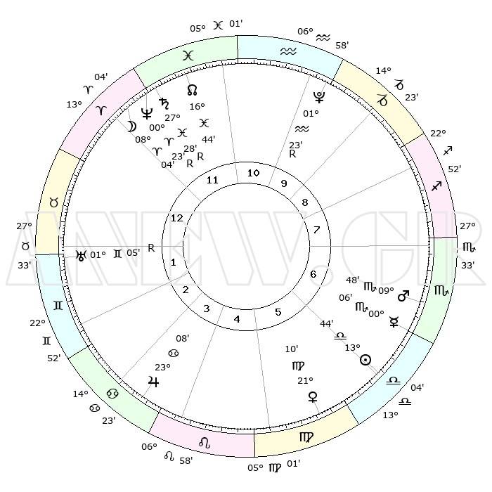 | ΘΕΣΕΙΣ ΠΛΑΝΗΤΩΝ ΑΣΤΡΟΛΟΓΙΚΟΥ ΧΑΡΤΗ ΤΗΣ ΣΤΙΓΜΗΣ ΑΥΤΗΣ | | Πλανήτης | Ζώδιο | Μοίρες | Δεκαήμ. | Σε οίκο | Απόκλιση | | Ακμές των οίκων | Ηλιος | Ζυγός | 13°38' | Δεύτερο | 7 | 05 S 23 | | 1ος | 04°31' | Κριός | Σελήνη | Κριός | 06°34' | Πρώτο | 1 | 04 N 07 | | 2ος | 13°41' | Ταύρος | Ερμής | Ζυγός | 29°57' | Τρίτο | 7 | 12 S 11 | | 3ος | 10°25' | Δίδυμοι | Αφροδίτη | Παρθένος | 21°03' | Τρίτο | 6 | 04 N 50 | | 4ος | 02°32' | Καρκίνος | Αρης | Σκορπιός | 09°44' | Πρώτο | 7 | 14 S 51 | | 5ος | 25°03' | Καρκίνος | Δίας | Καρκίνος | 23°07' | Τρίτο | 4 | 21 N 29 | | 6ος | 23°10' | Λέων | Κρόνος | Ιχθείς | 27°28'R | Τρίτο | 12 | 03 S 19 | | 7ος | 04°31' | Ζυγός | Ουρανός | Δίδυμοι | 01°05'R | Πρώτο | 2 | 20 N 10 | | 8ος | 13°41' | Σκορπιός | Ποσειδώνας | Κριός | 00°24'R | Πρώτο | 12 | 01 S 06 | | 9ος | 10°25' | Τοξότης | Πλούτωνας | Υδροχόος | 01°23'R | Πρώτο | 11 | 23 S 32 | | 10ος | 02°32' | Αιγόκερως | Β. Δεσμός | Ιχθείς | 16°45' | Δεύτερο | 12 | 05 S 14 | | 11ος | 25°03' | Αιγόκερως | Ωροσκόπος | Κριός | 04°31' | Πρώτο | | | 12ος | 23°10' | Υδροχόος | Μεσουράνημα | Αιγόκερως | 02°32' | Πρώτο | | | |