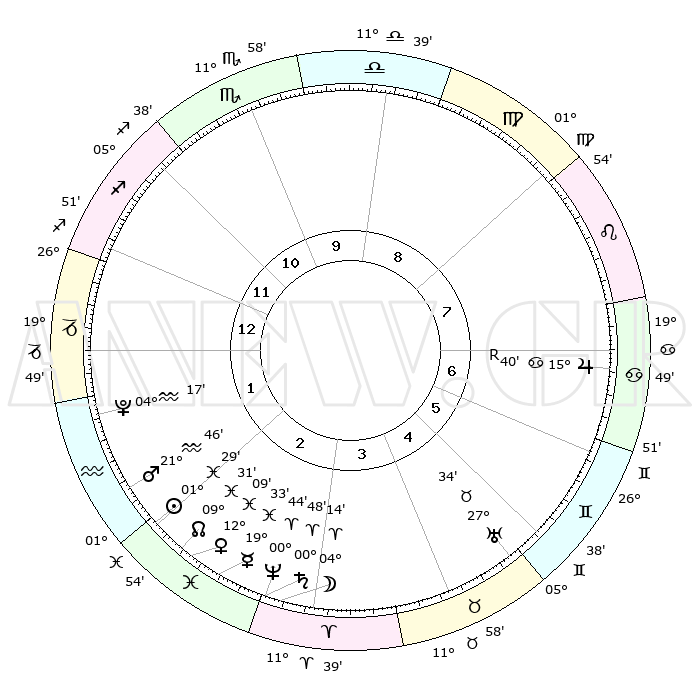 | | ΘΕΣΕΙΣ ΠΛΑΝΗΤΩΝ ΑΣΤΡΟΛΟΓΙΚΟΥ ΧΑΡΤΗ ΤΗΣ ΣΤΙΓΜΗΣ ΑΥΤΗΣ | | | | Πλανήτης | Ζώδιο | Μοίρες | Δεκαήμ. | Σε οίκο | Απόκλιση | | Ακμές των οίκων | | Ηλιος | Ιχθείς | 01°25' | Πρώτο | 2 | 10 S 58 | | 1ος | 25°01' | Τοξότης | | Σελήνη | Κριός | 03°16' | Πρώτο | 3 | 03 N 18 | | 2ος | 00°56' | Υδροχόος | | Ερμής | Ιχθείς | 19°29' | Δεύτερο | 3 | 03 S 00 | | 3ος | 10°29' | Ιχθείς | | Αφροδίτη | Ιχθείς | 12°04' | Δεύτερο | 3 | 08 S 23 | | 4ος | 15°10' | Κριός | | Αρης | Υδροχόος | 21°42' | Τρίτο | 2 | 15 S 18 | | 5ος | 12°17' | Ταύρος | | Δίας | Καρκίνος | 15°41'R | Δεύτερο | 7 | 22 N 51 | | 6ος | 04°27' | Δίδυμοι | | Κρόνος | Κριός | 00°48' | Πρώτο | 3 | 01 S 39 | | 7ος | 25°01' | Δίδυμοι | | Ουρανός | Ταύρος | 27°34' | Τρίτο | 5 | 19 N 26 | | 8ος | 00°56' | Λέων | | Ποσειδώνας | Κριός | 00°44' | Πρώτο | 3 | 00 S 54 | | 9ος | 10°29' | Παρθένος | | Πλούτωνας | Υδροχόος | 04°17' | Πρώτο | 2 | 22 S 55 | | 10ος | 15°10' | Ζυγός | | Β. Δεσμός | Ιχθείς | 09°31' | Πρώτο | 2 | 08 S 00 | | 11ος | 12°17' | Σκορπιός | | Ωροσκόπος | Τοξότης | 25°01' | Τρίτο | | | 12ος | 04°27' | Τοξότης | | Μεσουράνημα | Ζυγός | 15°10' | Δεύτερο | | | |