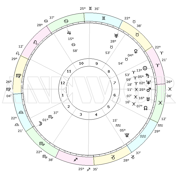 | | ΘΕΣΕΙΣ ΠΛΑΝΗΤΩΝ ΑΣΤΡΟΛΟΓΙΚΟΥ ΧΑΡΤΗ ΤΗΣ ΣΤΙΓΜΗΣ ΑΥΤΗΣ | | | | Πλανήτης | Ζώδιο | Μοίρες | Δεκαήμ. | Σε οίκο | Απόκλιση | | Ακμές των οίκων | | Ηλιος | Κριός | 13°49' | Δεύτερο | 8 | 05 N 27 | | 1ος | 06°16' | Παρθένος | | Σελήνη | Σκορπιός | 00°47' | Πρώτο | 3 | 15 S 34 | | 2ος | 00°46' | Ζυγός | | Ερμής | Ιχθείς | 16°03' | Δεύτερο | 7 | 07 S 03 | | 3ος | 29°58' | Ζυγός | | Αφροδίτη | Ταύρος | 04°49' | Πρώτο | 9 | 12 N 48 | | 4ος | 02°55' | Τοξότης | | Αρης | Ιχθείς | 25°08' | Τρίτο | 7 | 02 S 53 | | 5ος | 06°42' | Αιγόκερως | | Δίας | Καρκίνος | 15°57' | Δεύτερο | 11 | 22 N 51 | | 6ος | 08°13' | Υδροχόος | | Κρόνος | Κριός | 05°59' | Πρώτο | 8 | 00 N 25 | | 7ος | 06°16' | Ιχθείς | | Ουρανός | Ταύρος | 28°53' | Τρίτο | 9 | 19 N 44 | | 8ος | 00°46' | Κριός | | Ποσειδώνας | Κριός | 02°18' | Πρώτο | 8 | 00 S 17 | | 9ος | 29°58' | Κριός | | Πλούτωνας | Υδροχόος | 05°15' | Πρώτο | 5 | 22 S 47 | | 10ος | 02°55' | Δίδυμοι | | Β. Δεσμός | Ιχθείς | 07°16' | Πρώτο | 7 | 08 S 50 | | 11ος | 06°42' | Καρκίνος | | Ωροσκόπος | Παρθένος | 06°16' | Πρώτο | | | 12ος | 08°13' | Λέων | | Μεσουράνημα | Δίδυμοι | 02°55' | Πρώτο | | | |