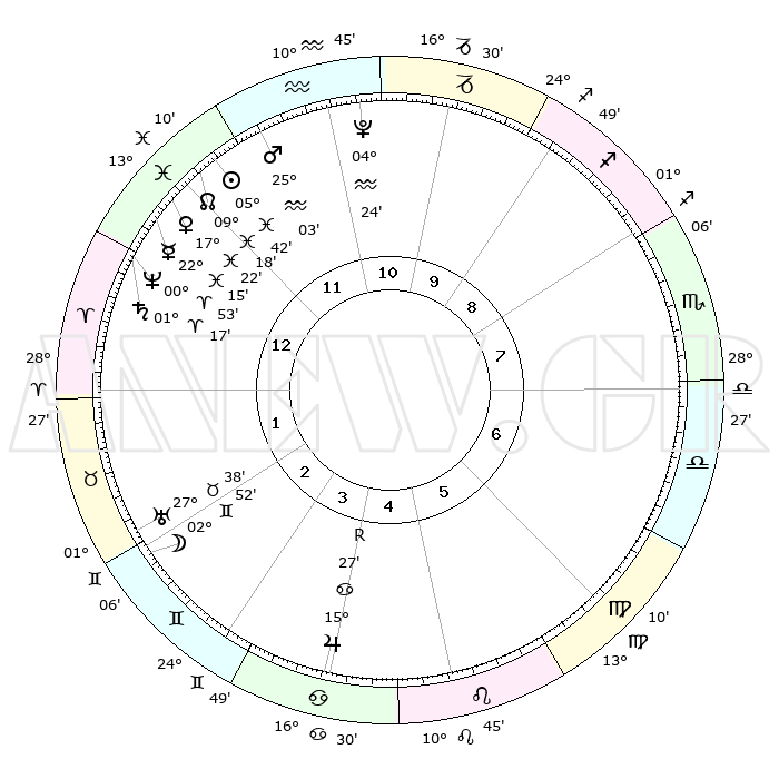 | | ΘΕΣΕΙΣ ΠΛΑΝΗΤΩΝ ΑΣΤΡΟΛΟΓΙΚΟΥ ΧΑΡΤΗ ΤΗΣ ΣΤΙΓΜΗΣ ΑΥΤΗΣ | | | | Πλανήτης | Ζώδιο | Μοίρες | Δεκαήμ. | Σε οίκο | Απόκλιση | | Ακμές των οίκων | | Ηλιος | Ιχθείς | 05°38' | Πρώτο | 12 | 09 S 27 | | 1ος | 27°18' | Ιχθείς | | Σελήνη | Δίδυμοι | 02°06' | Πρώτο | 2 | 25 N 43 | | 2ος | 08°14' | Ταύρος | | Ερμής | Ιχθείς | 22°14' | Τρίτο | 12 | 00 S 57 | | 3ος | 06°03' | Δίδυμοι | | Αφροδίτη | Ιχθείς | 17°18' | Δεύτερο | 12 | 06 S 19 | | 4ος | 28°29' | Δίδυμοι | | Αρης | Υδροχόος | 25°01' | Τρίτο | 12 | 14 S 13 | | 5ος | 20°40' | Καρκίνος | | Δίας | Καρκίνος | 15°27'R | Δεύτερο | 4 | 22 N 53 | | 6ος | 17°40' | Λέων | | Κρόνος | Κριός | 01°17' | Πρώτο | 1 | 01 S 27 | | 7ος | 27°18' | Παρθένος | | Ουρανός | Ταύρος | 27°38' | Τρίτο | 2 | 19 N 27 | | 8ος | 08°14' | Σκορπιός | | Ποσειδώνας | Κριός | 00°53' | Πρώτο | 1 | 00 S 51 | | 9ος | 06°03' | Τοξότης | | Πλούτωνας | Υδροχόος | 04°24' | Πρώτο | 11 | 22 S 54 | | 10ος | 28°29' | Τοξότης | | Β. Δεσμός | Ιχθείς | 09°18' | Πρώτο | 12 | 08 S 05 | | 11ος | 20°40' | Αιγόκερως | | Ωροσκόπος | Ιχθείς | 27°18' | Τρίτο | | | 12ος | 17°40' | Υδροχόος | | Μεσουράνημα | Τοξότης | 28°29' | Τρίτο | | | |