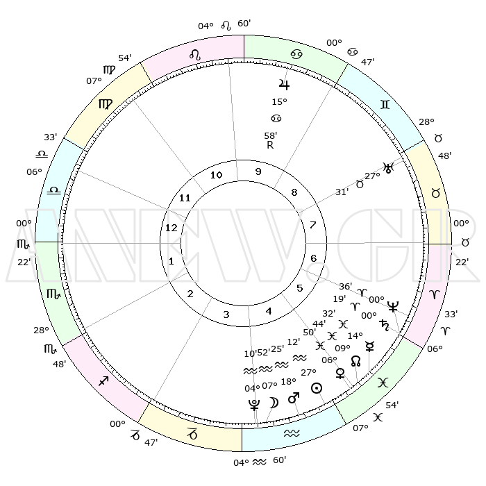 | | ΘΕΣΕΙΣ ΠΛΑΝΗΤΩΝ ΑΣΤΡΟΛΟΓΙΚΟΥ ΧΑΡΤΗ ΤΗΣ ΣΤΙΓΜΗΣ ΑΥΤΗΣ | | | | Πλανήτης | Ζώδιο | Μοίρες | Δεκαήμ. | Σε οίκο | Απόκλιση | | Ακμές των οίκων | | Ηλιος | Υδροχόος | 27°09' | Τρίτο | 5 | 12 S 28 | | 1ος | 14°44' | Ζυγός | | Σελήνη | Υδροχόος | 07°11' | Πρώτο | 4 | 21 S 10 | | 2ος | 12°16' | Σκορπιός | | Ερμής | Ιχθείς | 14°27' | Δεύτερο | 5 | 05 S 54 | | 3ος | 13°17' | Τοξότης | | Αφροδίτη | Ιχθείς | 06°46' | Πρώτο | 5 | 10 S 23 | | 4ος | 16°38' | Αιγόκερως | | Αρης | Υδροχόος | 18°23' | Δεύτερο | 4 | 16 S 21 | | 5ος | 19°35' | Υδροχόος | | Δίας | Καρκίνος | 15°58'R | Δεύτερο | 9 | 22 N 48 | | 6ος | 19°21' | Ιχθείς | | Κρόνος | Κριός | 00°19' | Πρώτο | 6 | 01 S 51 | | 7ος | 14°44' | Κριός | | Ουρανός | Ταύρος | 27°31' | Τρίτο | 8 | 19 N 25 | | 8ος | 12°16' | Ταύρος | | Ποσειδώνας | Κριός | 00°36' | Πρώτο | 6 | 00 S 58 | | 9ος | 13°17' | Δίδυμοι | | Πλούτωνας | Υδροχόος | 04°10' | Πρώτο | 4 | 22 S 56 | | 10ος | 16°38' | Καρκίνος | | Β. Δεσμός | Ιχθείς | 09°45' | Πρώτο | 5 | 07 S 55 | | 11ος | 19°35' | Λέων | | Ωροσκόπος | Ζυγός | 14°44' | Δεύτερο | | | 12ος | 19°21' | Παρθένος | | Μεσουράνημα | Καρκίνος | 16°38' | Δεύτερο | | | |