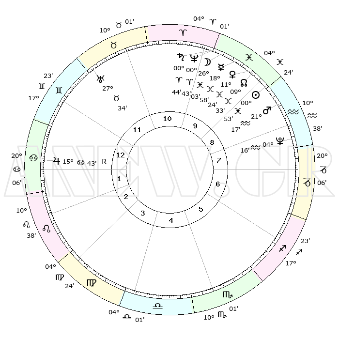 | | ΘΕΣΕΙΣ ΠΛΑΝΗΤΩΝ ΑΣΤΡΟΛΟΓΙΚΟΥ ΧΑΡΤΗ ΤΗΣ ΣΤΙΓΜΗΣ ΑΥΤΗΣ | | | | Πλανήτης | Ζώδιο | Μοίρες | Δεκαήμ. | Σε οίκο | Απόκλιση | | Ακμές των οίκων | | Ηλιος | Ιχθείς | 00°49' | Πρώτο | 9 | 11 S 11 | | 1ος | 28°43' | Δίδυμοι | | Σελήνη | Ιχθείς | 25°07' | Τρίτο | 10 | 00 S 35 | | 2ος | 19°36' | Καρκίνος | | Ερμής | Ιχθείς | 18°54' | Δεύτερο | 10 | 03 S 22 | | 3ος | 11°19' | Λέων | | Αφροδίτη | Ιχθείς | 11°19' | Δεύτερο | 10 | 08 S 40 | | 4ος | 07°26' | Παρθένος | | Αρης | Υδροχόος | 21°14' | Τρίτο | 9 | 15 S 27 | | 5ος | 11°09' | Ζυγός | | Δίας | Καρκίνος | 15°43'R | Δεύτερο | 1 | 22 N 50 | | 6ος | 21°15' | Σκορπιός | | Κρόνος | Κριός | 00°44' | Πρώτο | 10 | 01 S 41 | | 7ος | 28°43' | Τοξότης | | Ουρανός | Ταύρος | 27°34' | Τρίτο | 12 | 19 N 26 | | 8ος | 19°36' | Αιγόκερως | | Ποσειδώνας | Κριός | 00°43' | Πρώτο | 10 | 00 S 55 | | 9ος | 11°19' | Υδροχόος | | Πλούτωνας | Υδροχόος | 04°16' | Πρώτο | 8 | 22 S 55 | | 10ος | 07°26' | Ιχθείς | | Β. Δεσμός | Ιχθείς | 09°33' | Πρώτο | 10 | 07 S 59 | | 11ος | 11°09' | Κριός | | Ωροσκόπος | Δίδυμοι | 28°43' | Τρίτο | | | 12ος | 21°15' | Ταύρος | | Μεσουράνημα | Ιχθείς | 07°26' | Πρώτο | | | |