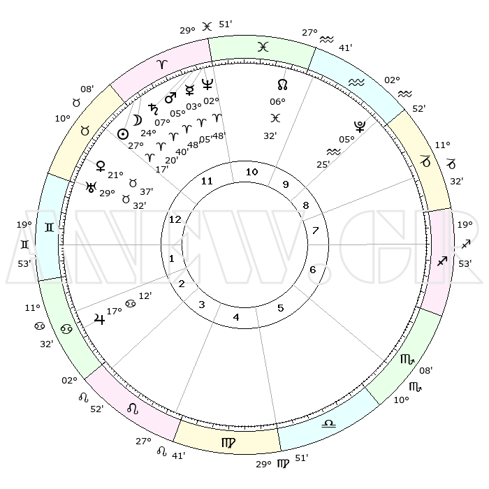 | | ΘΕΣΕΙΣ ΠΛΑΝΗΤΩΝ ΑΣΤΡΟΛΟΓΙΚΟΥ ΧΑΡΤΗ ΤΗΣ ΣΤΙΓΜΗΣ ΑΥΤΗΣ | | | | Πλανήτης | Ζώδιο | Μοίρες | Δεκαήμ. | Σε οίκο | Απόκλιση | | Ακμές των οίκων | | Ηλιος | Κριός | 27°14' | Τρίτο | 12 | 10 N 29 | | 1ος | 29°53' | Ταύρος | | Σελήνη | Κριός | 23°35' | Τρίτο | 12 | 12 N 33 | | 2ος | 24°43' | Δίδυμοι | | Ερμής | Κριός | 03°01' | Πρώτο | 11 | 01 S 13 | | 3ος | 16°09' | Καρκίνος | | Αφροδίτη | Ταύρος | 21°33' | Τρίτο | 12 | 18 N 25 | | 4ος | 08°54' | Λέων | | Αρης | Κριός | 05°46' | Πρώτο | 11 | 01 N 24 | | 5ος | 07°20' | Παρθένος | | Δίας | Καρκίνος | 17°12' | Δεύτερο | 3 | 22 N 42 | | 6ος | 15°46' | Ζυγός | | Κρόνος | Κριός | 07°39' | Πρώτο | 11 | 01 N 04 | | 7ος | 29°53' | Σκορπιός | | Ουρανός | Ταύρος | 29°32' | Τρίτο | 12 | 19 N 53 | | 8ος | 24°43' | Τοξότης | | Ποσειδώνας | Κριός | 02°48' | Πρώτο | 11 | 00 S 05 | | 9ος | 16°09' | Αιγόκερως | | Πλούτωνας | Υδροχόος | 05°25' | Πρώτο | 9 | 22 S 47 | | 10ος | 08°54' | Υδροχόος | | Β. Δεσμός | Ιχθείς | 06°33' | Πρώτο | 10 | 09 S 06 | | 11ος | 07°20' | Ιχθείς | | Ωροσκόπος | Ταύρος | 29°53' | Τρίτο | | | 12ος | 15°46' | Κριός | | Μεσουράνημα | Υδροχόος | 08°54' | Πρώτο | | | |