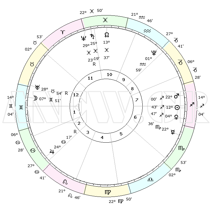| | ΘΕΣΕΙΣ ΠΛΑΝΗΤΩΝ ΑΣΤΡΟΛΟΓΙΚΟΥ ΧΑΡΤΗ ΤΗΣ ΣΤΙΓΜΗΣ ΑΥΤΗΣ | | | | Πλανήτης | Ζώδιο | Μοίρες | Δεκαήμ. | Σε οίκο | Απόκλιση | | Ακμές των οίκων | | Ηλιος | Τοξότης | 12°41' | Δεύτερο | 7 | 22 S 19 | | 1ος | 02°34' | Δίδυμοι | | Σελήνη | Δίδυμοι | 07°25' | Πρώτο | 1 | 26 N 26 | | 2ος | 26°52' | Δίδυμοι | | Ερμής | Σκορπιός | 22°34' | Τρίτο | 6 | 15 S 56 | | 3ος | 18°12' | Καρκίνος | | Αφροδίτη | Τοξότης | 04°44' | Πρώτο | 7 | 20 S 31 | | 4ος | 11°10' | Λέων | | Αρης | Τοξότης | 21°59' | Τρίτο | 7 | 23 S 53 | | 5ος | 10°04' | Παρθένος | | Δίας | Καρκίνος | 24°17'R | Τρίτο | 3 | 21 N 25 | | 6ος | 18°54' | Ζυγός | | Κρόνος | Ιχθείς | 25°19' | Τρίτο | 11 | 04 S 01 | | 7ος | 02°34' | Τοξότης | | Ουρανός | Ταύρος | 28°54'R | Τρίτο | 12 | 19 N 42 | | 8ος | 26°52' | Τοξότης | | Ποσειδώνας | Ιχθείς | 29°23'R | Τρίτο | 11 | 01 S 29 | | 9ος | 18°12' | Αιγόκερως | | Πλούτωνας | Υδροχόος | 01°59' | Πρώτο | 9 | 23 S 23 | | 10ος | 11°10' | Υδροχόος | | Β. Δεσμός | Ιχθείς | 13°37' | Δεύτερο | 11 | 06 S 26 | | 11ος | 10°04' | Ιχθείς | | Ωροσκόπος | Δίδυμοι | 02°34' | Πρώτο | | | 12ος | 18°54' | Κριός | | Μεσουράνημα | Υδροχόος | 11°10' | Δεύτερο | | | |