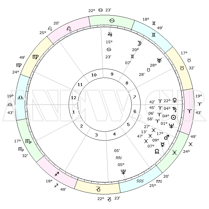 | | ΘΕΣΕΙΣ ΠΛΑΝΗΤΩΝ ΑΣΤΡΟΛΟΓΙΚΟΥ ΧΑΡΤΗ ΤΗΣ ΣΤΙΓΜΗΣ ΑΥΤΗΣ | | | | Πλανήτης | Ζώδιο | Μοίρες | Δεκαήμ. | Σε οίκο | Απόκλιση | | Ακμές των οίκων | | Ηλιος | Κριός | 04°03' | Πρώτο | 7 | 01 N 36 | | 1ος | 02°09' | Ζυγός | | Σελήνη | Δίδυμοι | 19°16' | Δεύτερο | 9 | 28 N 07 | | 2ος | 28°53' | Ζυγός | | Ερμής | Ιχθείς | 09°12' | Πρώτο | 6 | 08 S 03 | | 3ος | 29°24' | Σκορπιός | | Αφροδίτη | Κριός | 22°38' | Τρίτο | 7 | 08 N 08 | | 4ος | 02°24' | Αιγόκερως | | Αρης | Ιχθείς | 17°24' | Δεύτερο | 6 | 05 S 58 | | 5ος | 05°22' | Υδροχόος | | Δίας | Καρκίνος | 15°23' | Δεύτερο | 10 | 22 N 55 | | 6ος | 05°43' | Ιχθείς | | Κρόνος | Κριός | 04°45' | Πρώτο | 7 | 00 S 04 | | 7ος | 02°09' | Κριός | | Ουρανός | Ταύρος | 28°28' | Τρίτο | 8 | 19 N 39 | | 8ος | 28°53' | Κριός | | Ποσειδώνας | Κριός | 01°56' | Πρώτο | 6 | 00 S 26 | | 9ος | 29°24' | Ταύρος | | Πλούτωνας | Υδροχόος | 05°05' | Πρώτο | 4 | 22 S 48 | | 10ος | 02°24' | Καρκίνος | | Β. Δεσμός | Ιχθείς | 07°47' | Πρώτο | 6 | 08 S 39 | | 11ος | 05°22' | Λέων | | Ωροσκόπος | Ζυγός | 02°09' | Πρώτο | | | 12ος | 05°43' | Παρθένος | | Μεσουράνημα | Καρκίνος | 02°24' | Πρώτο | | | |
