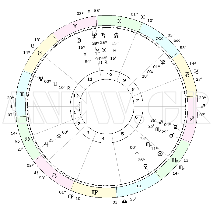 | | ΘΕΣΕΙΣ ΠΛΑΝΗΤΩΝ ΑΣΤΡΟΛΟΓΙΚΟΥ ΧΑΡΤΗ ΤΗΣ ΣΤΙΓΜΗΣ ΑΥΤΗΣ | | | | Πλανήτης | Ζώδιο | Μοίρες | Δεκαήμ. | Σε οίκο | Απόκλιση | | Ακμές των οίκων | | Ηλιος | Σκορπιός | 11°16' | Δεύτερο | 9 | 15 S 12 | | 1ος | 27°45' | Αιγόκερως | | Σελήνη | Κριός | 11°32' | Δεύτερο | 2 | 06 N 31 | | 2ος | 11°28' | Ιχθείς | | Ερμής | Τοξότης | 04°23' | Πρώτο | 10 | 23 S 50 | | 3ος | 20°15' | Κριός | | Αφροδίτη | Ζυγός | 25°38' | Τρίτο | 9 | 08 S 34 | | 4ος | 19°07' | Ταύρος | | Αρης | Σκορπιός | 29°13' | Τρίτο | 10 | 20 S 23 | | 5ος | 12°03' | Δίδυμοι | | Δίας | Καρκίνος | 25°02' | Τρίτο | 6 | 21 N 12 | | 6ος | 03°23' | Καρκίνος | | Κρόνος | Ιχθείς | 25°49'R | Τρίτο | 2 | 03 S 55 | | 7ος | 27°45' | Καρκίνος | | Ουρανός | Δίδυμοι | 00°11'R | Πρώτο | 4 | 19 N 59 | | 8ος | 11°28' | Παρθένος | | Ποσειδώνας | Ιχθείς | 29°44'R | Τρίτο | 2 | 01 S 21 | | 9ος | 20°15' | Ζυγός | | Πλούτωνας | Υδροχόος | 01°28' | Πρώτο | 1 | 23 S 30 | | 10ος | 19°07' | Σκορπιός | | Β. Δεσμός | Ιχθείς | 15°16' | Δεύτερο | 2 | 05 S 48 | | 11ος | 12°03' | Τοξότης | | Ωροσκόπος | Αιγόκερως | 27°45' | Τρίτο | | | 12ος | 03°23' | Αιγόκερως | | Μεσουράνημα | Σκορπιός | 19°07' | Δεύτερο | | | |