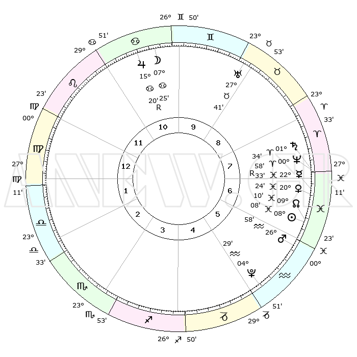 | | ΘΕΣΕΙΣ ΠΛΑΝΗΤΩΝ ΑΣΤΡΟΛΟΓΙΚΟΥ ΧΑΡΤΗ ΤΗΣ ΣΤΙΓΜΗΣ ΑΥΤΗΣ | | | | Πλανήτης | Ζώδιο | Μοίρες | Δεκαήμ. | Σε οίκο | Απόκλιση | | Ακμές των οίκων | | Ηλιος | Ιχθείς | 08°05' | Πρώτο | 6 | 08 S 32 | | 1ος | 09°37' | Παρθένος | | Σελήνη | Καρκίνος | 06°34' | Πρώτο | 10 | 27 N 57 | | 2ος | 04°27' | Ζυγός | | Ερμής | Ιχθείς | 22°33'R | Τρίτο | 7 | 00 S 19 | | 3ος | 03°52' | Σκορπιός | | Αφροδίτη | Ιχθείς | 20°20' | Τρίτο | 7 | 05 S 07 | | 4ος | 06°50' | Τοξότης | | Αρης | Υδροχόος | 26°56' | Τρίτο | 6 | 13 S 34 | | 5ος | 10°26' | Αιγόκερως | | Δίας | Καρκίνος | 15°20'R | Δεύτερο | 11 | 22 N 53 | | 6ος | 11°45' | Υδροχόος | | Κρόνος | Κριός | 01°34' | Πρώτο | 7 | 01 S 20 | | 7ος | 09°37' | Ιχθείς | | Ουρανός | Ταύρος | 27°41' | Τρίτο | 9 | 19 N 28 | | 8ος | 04°27' | Κριός | | Ποσειδώνας | Κριός | 00°58' | Πρώτο | 7 | 00 S 49 | | 9ος | 03°52' | Ταύρος | | Πλούτωνας | Υδροχόος | 04°28' | Πρώτο | 5 | 22 S 53 | | 10ος | 06°50' | Δίδυμοι | | Β. Δεσμός | Ιχθείς | 09°10' | Πρώτο | 6 | 08 S 08 | | 11ος | 10°26' | Καρκίνος | | Ωροσκόπος | Παρθένος | 09°37' | Πρώτο | | | 12ος | 11°45' | Λέων | | Μεσουράνημα | Δίδυμοι | 06°50' | Πρώτο | | | |