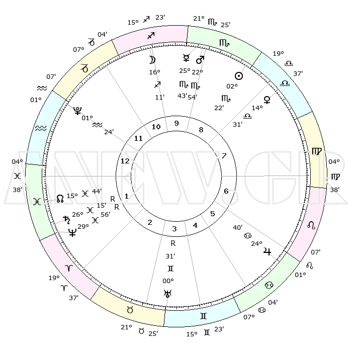 | | ΘΕΣΕΙΣ ΠΛΑΝΗΤΩΝ ΑΣΤΡΟΛΟΓΙΚΟΥ ΧΑΡΤΗ ΤΗΣ ΣΤΙΓΜΗΣ ΑΥΤΗΣ | | | | Πλανήτης | Ζώδιο | Μοίρες | Δεκαήμ. | Σε οίκο | Απόκλιση | | Ακμές των οίκων | | Ηλιος | Σκορπιός | 01°56' | Πρώτο | 2 | 12 S 08 | | 1ος | 01°35' | Ζυγός | | Σελήνη | Τοξότης | 10°51' | Δεύτερο | 3 | 27 S 07 | | 2ος | 28°17' | Ζυγός | | Ερμής | Σκορπιός | 25°11' | Τρίτο | 2 | 21 S 36 | | 3ος | 28°47' | Σκορπιός | | Αφροδίτη | Ζυγός | 13°57' | Δεύτερο | 1 | 04 S 06 | | 4ος | 01°47' | Αιγόκερως | | Αρης | Σκορπιός | 22°35' | Τρίτο | 2 | 18 S 44 | | 5ος | 04°45' | Υδροχόος | | Δίας | Καρκίνος | 24°39' | Τρίτο | 10 | 21 N 15 | | 6ος | 05°07' | Ιχθείς | | Κρόνος | Ιχθείς | 26°16'R | Τρίτο | 6 | 03 S 46 | | 7ος | 01°35' | Κριός | | Ουρανός | Δίδυμοι | 00°32'R | Πρώτο | 9 | 20 N 03 | | 8ος | 28°17' | Κριός | | Ποσειδώνας | Ιχθείς | 29°56'R | Τρίτο | 6 | 01 S 17 | | 9ος | 28°47' | Ταύρος | | Πλούτωνας | Υδροχόος | 01°24' | Πρώτο | 4 | 23 S 32 | | 10ος | 01°47' | Καρκίνος | | Β. Δεσμός | Ιχθείς | 15°46' | Δεύτερο | 6 | 05 S 37 | | 11ος | 04°45' | Λέων | | Ωροσκόπος | Ζυγός | 01°35' | Πρώτο | | | 12ος | 05°07' | Παρθένος | | Μεσουράνημα | Καρκίνος | 01°47' | Πρώτο | | | |