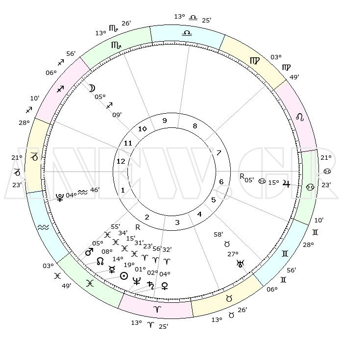| | ΘΕΣΕΙΣ ΠΛΑΝΗΤΩΝ ΑΣΤΡΟΛΟΓΙΚΟΥ ΧΑΡΤΗ ΤΗΣ ΣΤΙΓΜΗΣ ΑΥΤΗΣ | | | | Πλανήτης | Ζώδιο | Μοίρες | Δεκαήμ. | Σε οίκο | Απόκλιση | | Ακμές των οίκων | | Ηλιος | Ιχθείς | 19°27' | Δεύτερο | 2 | 04 S 10 | | 1ος | 02°01' | Αιγόκερως | | Σελήνη | Τοξότης | 04°31' | Πρώτο | 11 | 26 S 12 | | 2ος | 09°41' | Υδροχόος | | Ερμής | Ιχθείς | 14°18'R | Δεύτερο | 2 | 03 S 03 | | 3ος | 19°49' | Ιχθείς | | Αφροδίτη | Κριός | 04°28' | Πρώτο | 3 | 00 N 41 | | 4ος | 23°25' | Κριός | | Αρης | Ιχθείς | 05°52' | Πρώτο | 2 | 10 S 22 | | 5ος | 19°25' | Ταύρος | | Δίας | Καρκίνος | 15°05'R | Δεύτερο | 7 | 22 N 56 | | 6ος | 11°06' | Δίδυμοι | | Κρόνος | Κριός | 02°56' | Πρώτο | 3 | 00 S 47 | | 7ος | 02°01' | Καρκίνος | | Ουρανός | Ταύρος | 27°58' | Τρίτο | 5 | 19 N 32 | | 8ος | 09°41' | Λέων | | Ποσειδώνας | Κριός | 01°23' | Πρώτο | 3 | 00 S 39 | | 9ος | 19°49' | Παρθένος | | Πλούτωνας | Υδροχόος | 04°46' | Πρώτο | 1 | 22 S 50 | | 10ος | 23°25' | Ζυγός | | Β. Δεσμός | Ιχθείς | 08°34' | Πρώτο | 2 | 08 S 21 | | 11ος | 19°25' | Σκορπιός | | Ωροσκόπος | Αιγόκερως | 02°01' | Πρώτο | | | 12ος | 11°06' | Τοξότης | | Μεσουράνημα | Ζυγός | 23°25' | Τρίτο | | | |