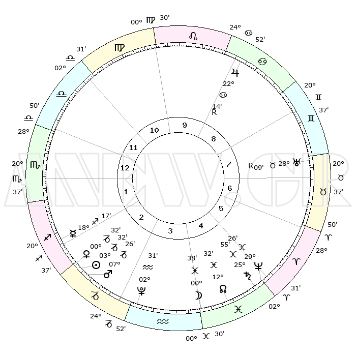 | | ΘΕΣΕΙΣ ΠΛΑΝΗΤΩΝ ΑΣΤΡΟΛΟΓΙΚΟΥ ΧΑΡΤΗ ΤΗΣ ΣΤΙΓΜΗΣ ΑΥΤΗΣ | | | | Πλανήτης | Ζώδιο | Μοίρες | Δεκαήμ. | Σε οίκο | Απόκλιση | | Ακμές των οίκων | | Ηλιος | Αιγόκερως | 03°27' | Πρώτο | 3 | 23 S 23 | | 1ος | 24°13' | Ζυγός | | Σελήνη | Υδροχόος | 29°29' | Τρίτο | 4 | 12 S 38 | | 2ος | 22°17' | Σκορπιός | | Ερμής | Τοξότης | 18°09' | Δεύτερο | 2 | 22 S 39 | | 3ος | 23°50' | Τοξότης | | Αφροδίτη | Αιγόκερως | 00°25' | Πρώτο | 3 | 23 S 40 | | 4ος | 27°39' | Αιγόκερως | | Αρης | Αιγόκερως | 07°21' | Πρώτο | 3 | 24 S 04 | | 5ος | 00°36' | Ιχθείς | | Δίας | Καρκίνος | 22°14'R | Τρίτο | 9 | 21 N 49 | | 6ος | 29°45' | Ιχθείς | | Κρόνος | Ιχθείς | 25°55' | Τρίτο | 5 | 03 S 43 | | 7ος | 24°13' | Κριός | | Ουρανός | Ταύρος | 28°09'R | Τρίτο | 8 | 19 N 33 | | 8ος | 22°17' | Ταύρος | | Ποσειδώνας | Ιχθείς | 29°26' | Τρίτο | 5 | 01 S 27 | | 9ος | 23°50' | Δίδυμοι | | Πλούτωνας | Υδροχόος | 02°31' | Πρώτο | 4 | 23 S 16 | | 10ος | 27°39' | Καρκίνος | | Β. Δεσμός | Ιχθείς | 12°32' | Δεύτερο | 5 | 06 S 51 | | 11ος | 00°36' | Παρθένος | | Ωροσκόπος | Ζυγός | 24°13' | Τρίτο | | | 12ος | 29°45' | Παρθένος | | Μεσουράνημα | Καρκίνος | 27°39' | Τρίτο | | | |